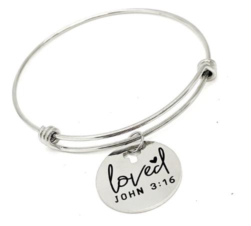 Keep a daily reminder of God’s everlasting love close to your heart with this beautifully crafted bracelet from JKCE Designs. The stainless steel expanding bangle features a polished 25mm charm engraved with “loved JOHN 3:16”, complete with a small heart detail above the “d” and a cross cut-out where the charm connects. The adjustable design ensures a comfortable fit for most wrist sizes, combining style and faith in one elegant piece. Perfect for daily wear or as a thoughtful Christian gift for someone special.