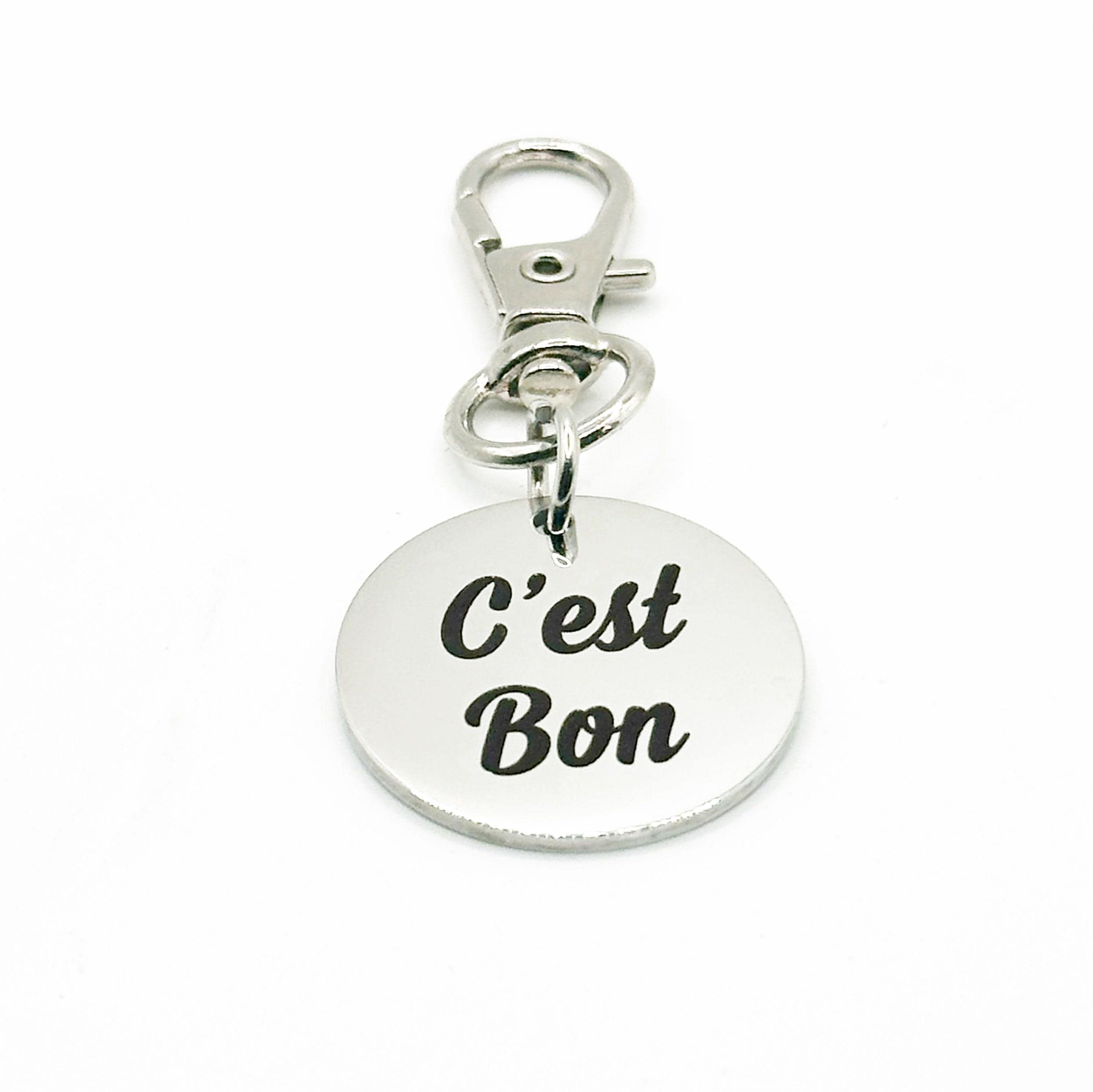 Crafted from high-quality stainless steel, the engraved charm features the phrase “C’est Bon”, meaning “It’s Good” — a cheerful sentiment perfect for daily inspiration. The smooth, polished finish and secure clip make it easy to attach to a purse, backpack, zipper, keyring, planner, or tote.