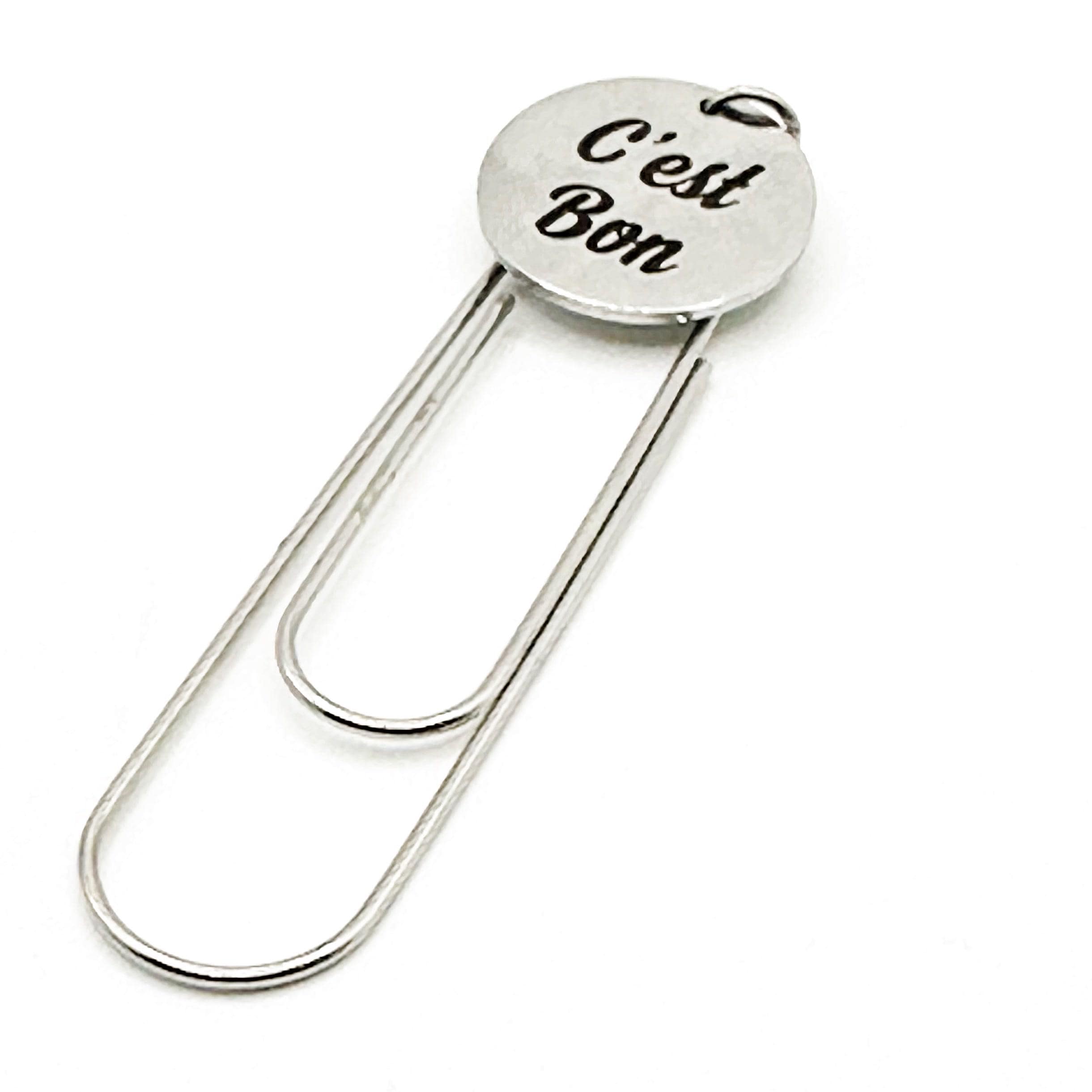 The bookmark features a stainless steel engraved charm reading “C’est Bon”, meaning “It’s Good”, attached to a sleek paperclip-style bookmark that slides easily onto pages without damaging them. Perfect for books, planners, journals, devotionals, or notebooks.