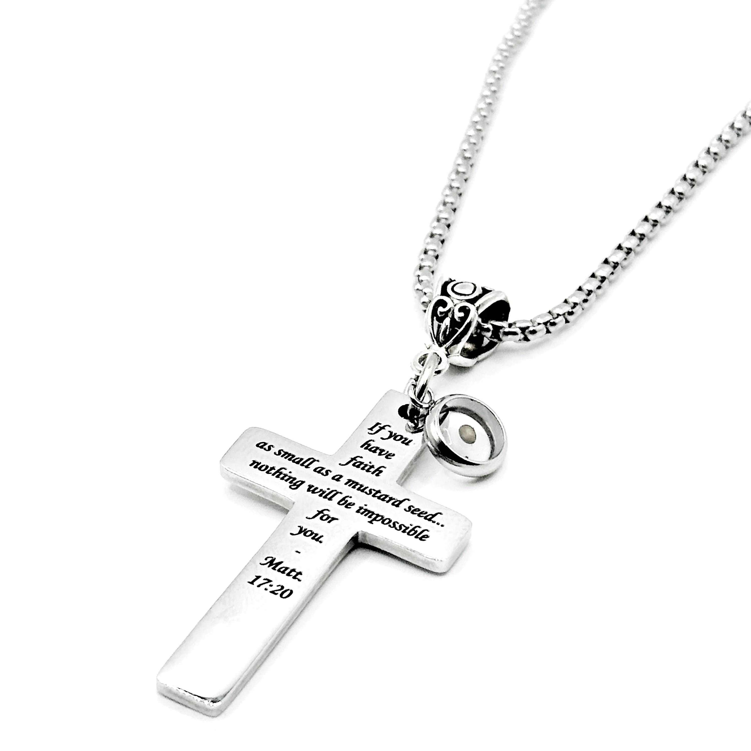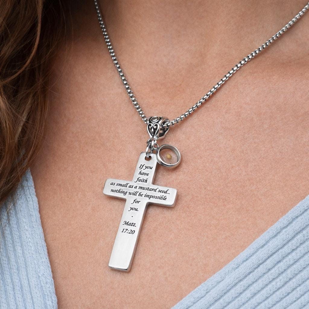 Wear a beautiful reminder of faith close to your heart with this Mustard Seed Cross Necklace from JKCE Designs.