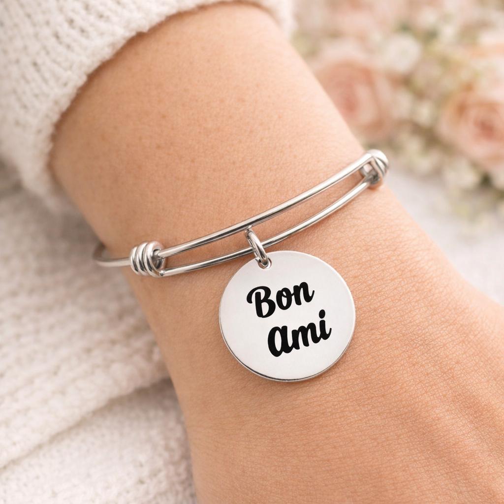 The polished charm reads Bon Ami in the same clean script shown in your product photo. Bon Ami is a French phrase that literally means good friend, a sweet, classic way to honor someone special.