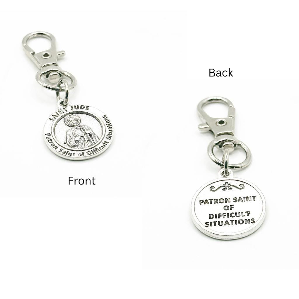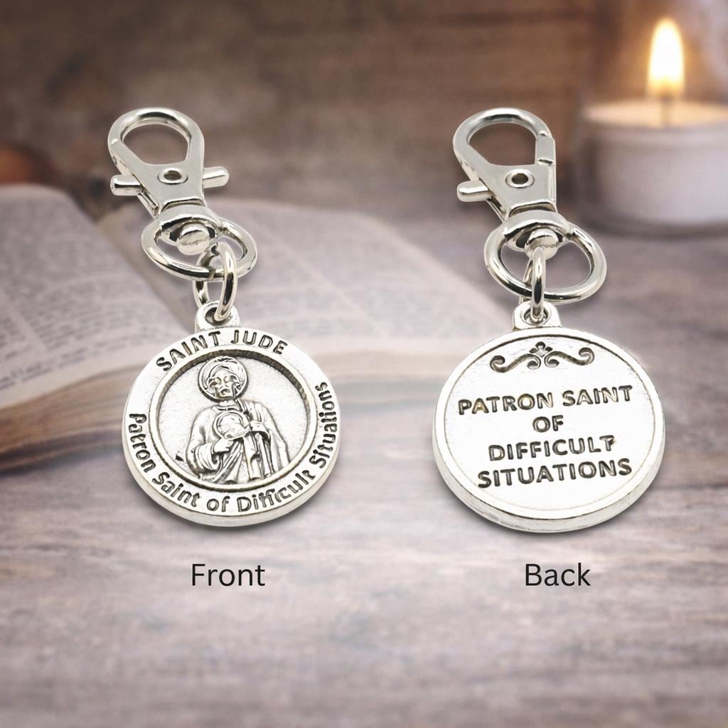 This silver-plated charm features a beautifully detailed Saint Jude image on the front with the inscription “Saint Jude Patron Saint of Difficult Situations.” The back reads “Patron Saint of Difficult Situations,” offering encouragement and strength from both sides. Easily clip it onto a purse, backpack, zipper, keyring, or Bible case to keep faith close at hand.