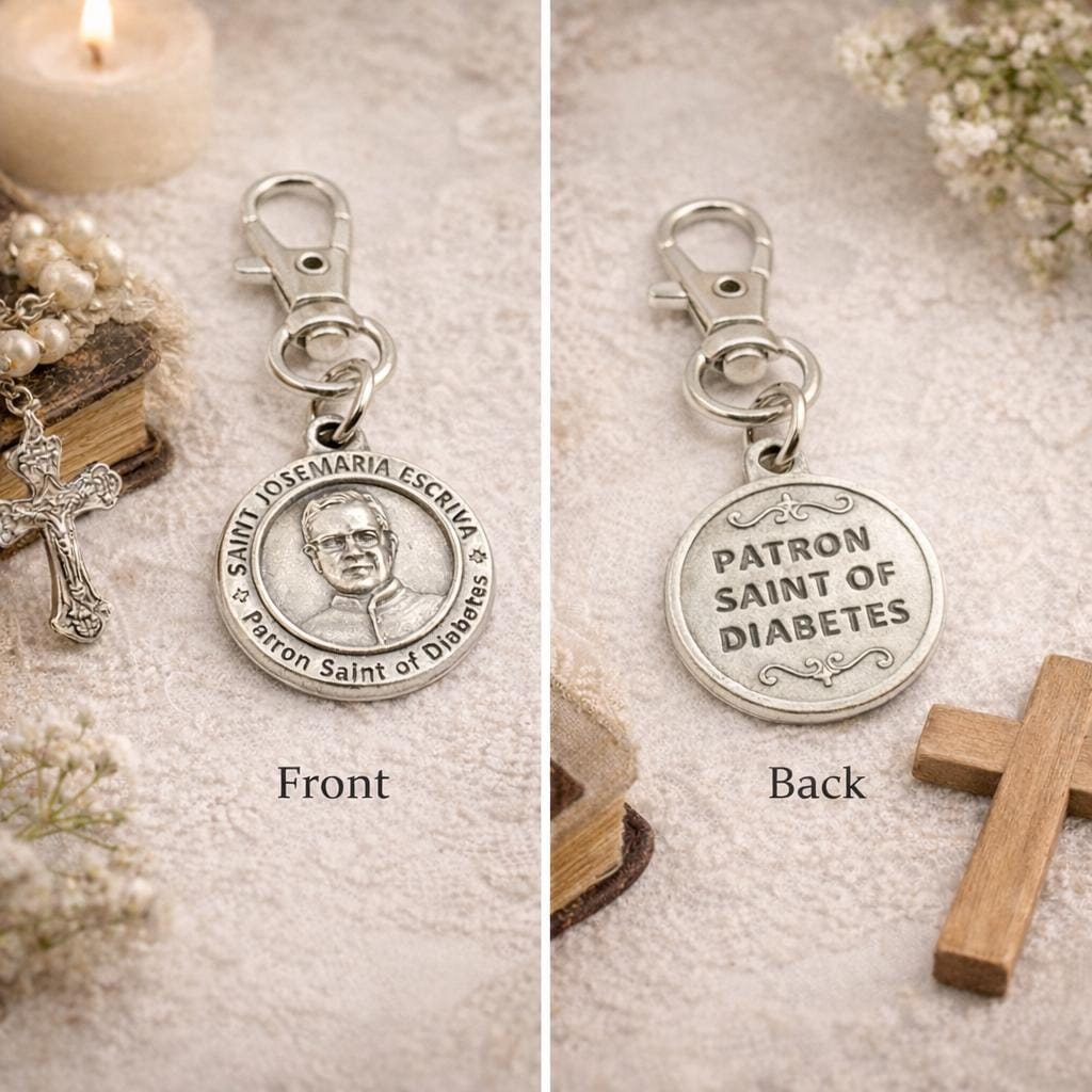 The silver-plated charm features an engraved portrait of Saint Josemaria Escriva, recognized as the Patron Saint of Diabetes, making it a thoughtful and faith-filled gift.