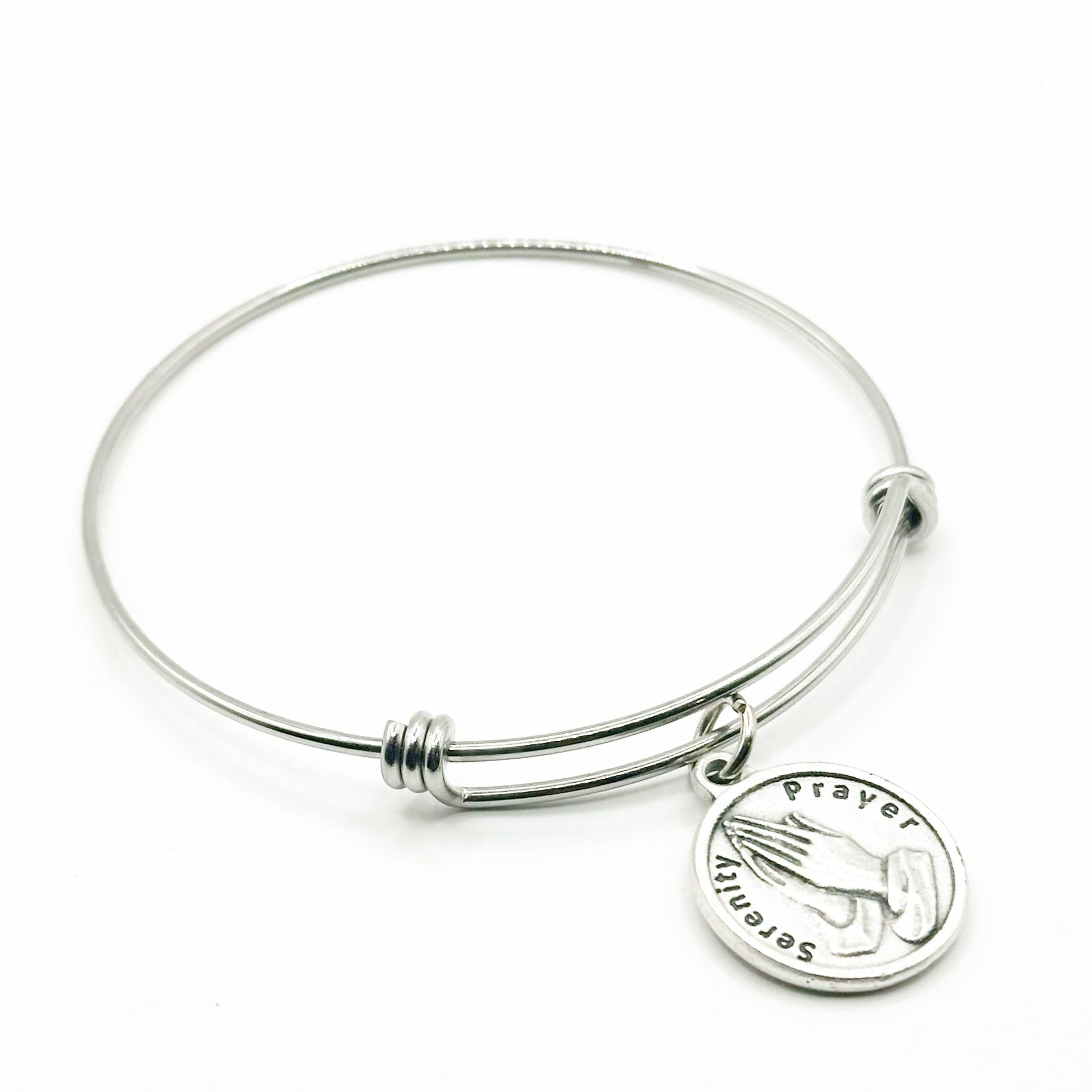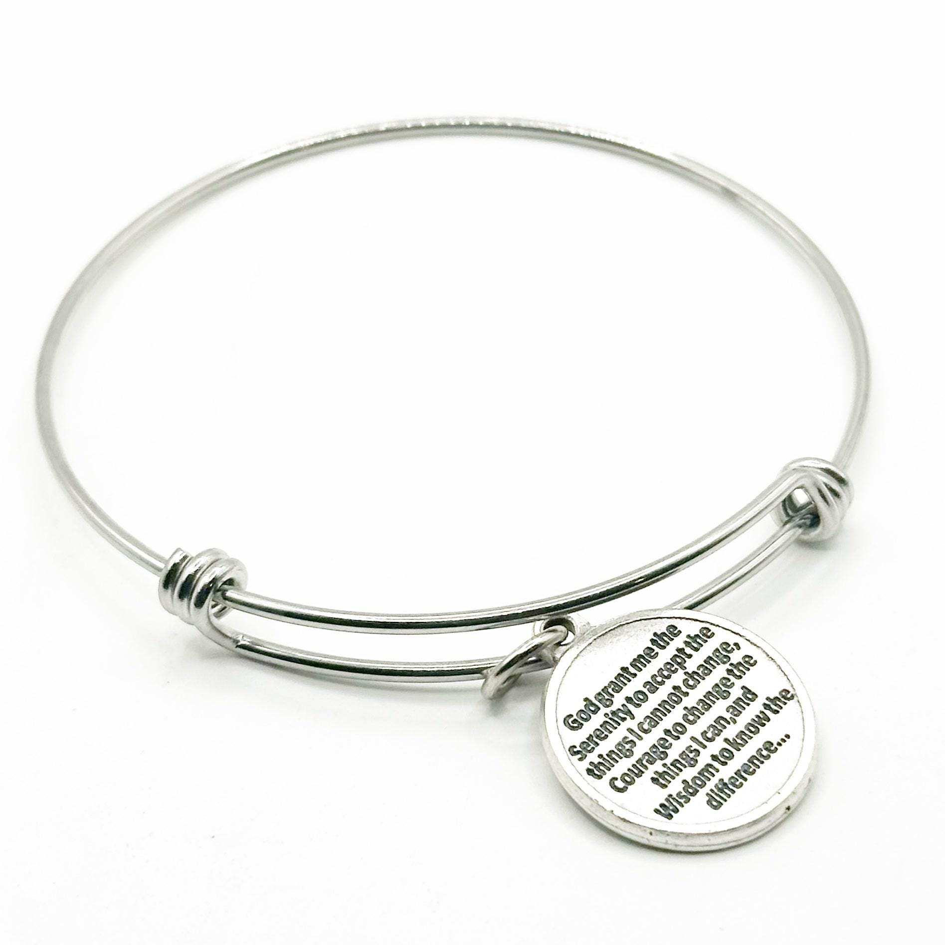 This meaningful bracelet features a silver-plated Serenity Prayer charm suspended from a sleek stainless steel expanding bangle for a comfortable, adjustable fit. The charm is engraved on both sides, making it a powerful symbol of encouragement and hope.