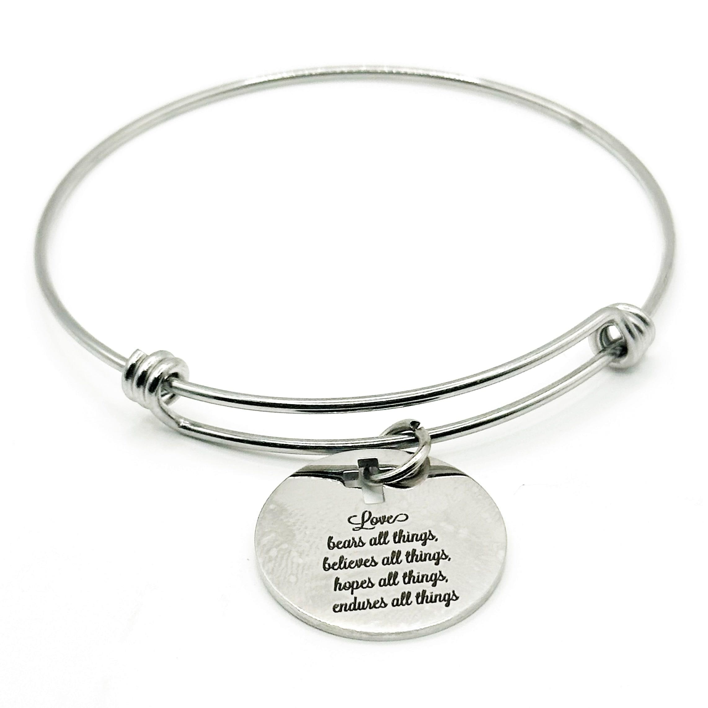 Wear a meaningful reminder of faith and love every day with this elegant bracelet from JKCE Designs. This stainless steel expanding bangle features a beautifully engraved round charm with a timeless message rooted in scripture.