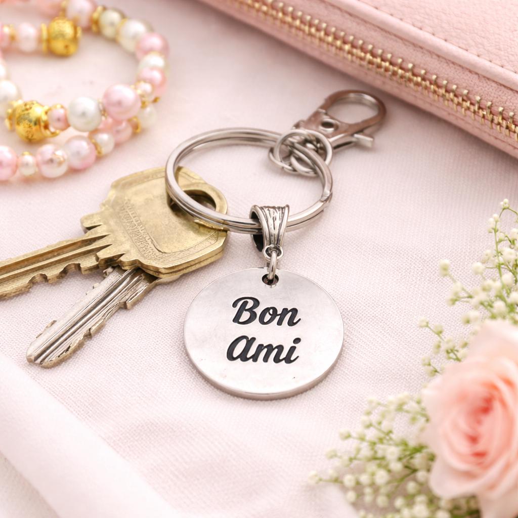 A simple reminder of a beautiful friendship you can carry every day. This Bon Ami keychain from JKCE Designs features a stainless steel engraved charm paired with durable keychain hardware, making it both meaningful and practical.