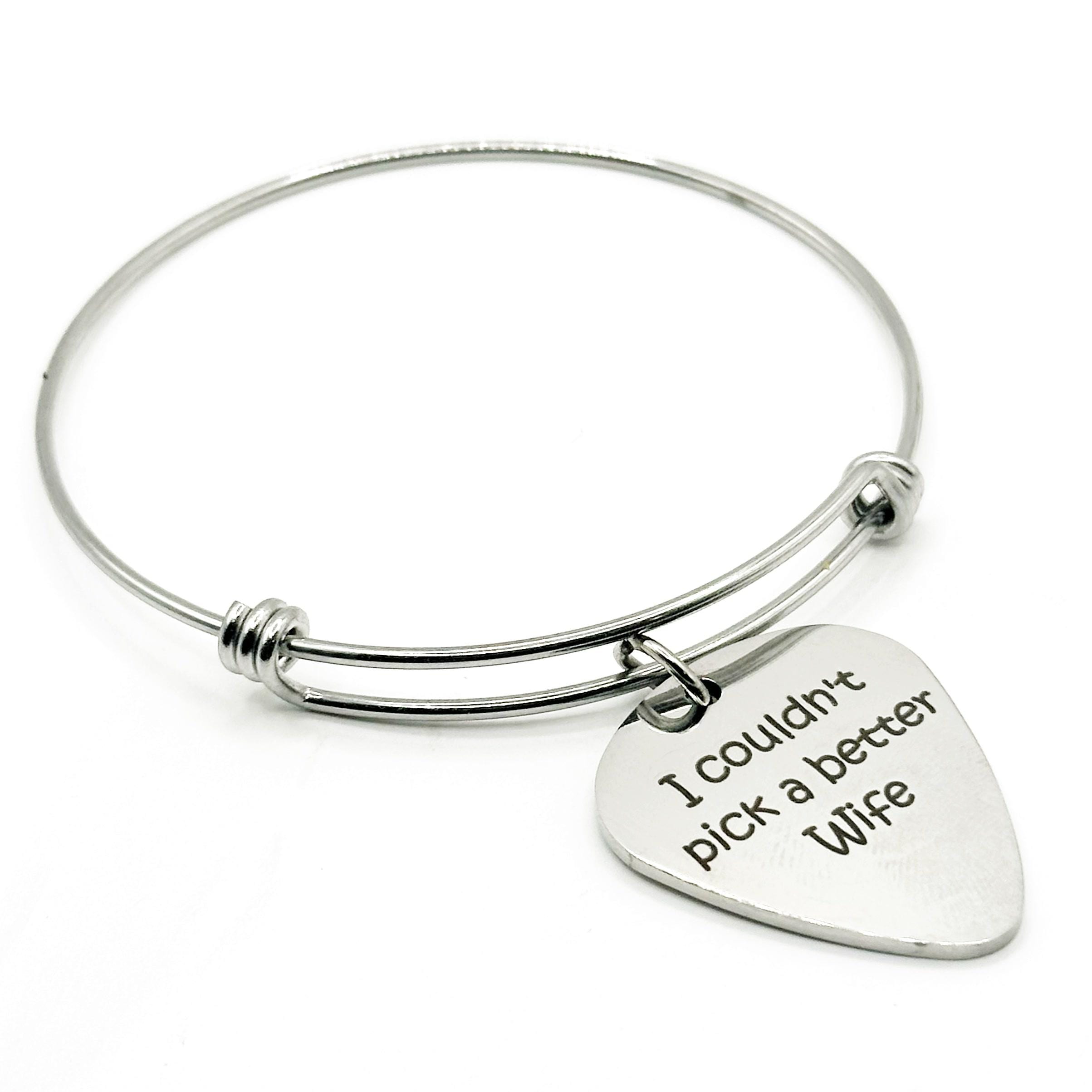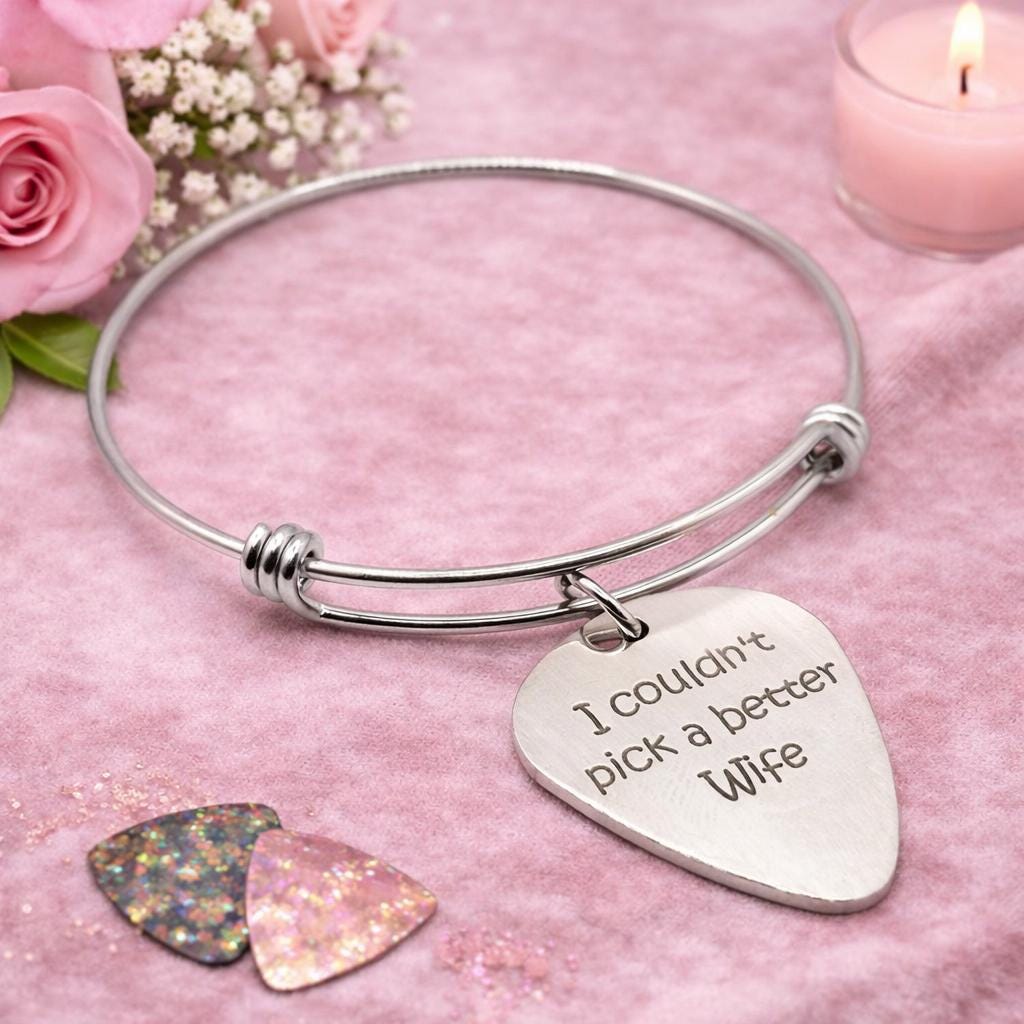 Celebrate the one who makes your life better every day with this meaningful stainless steel expanding bangle bracelet from JKCE Designs. Featuring a guitar pick shaped engraved charm, this bracelet is a sweet and lasting reminder of love—perfect for anniversaries, birthdays, Valentine’s Day, or just because.