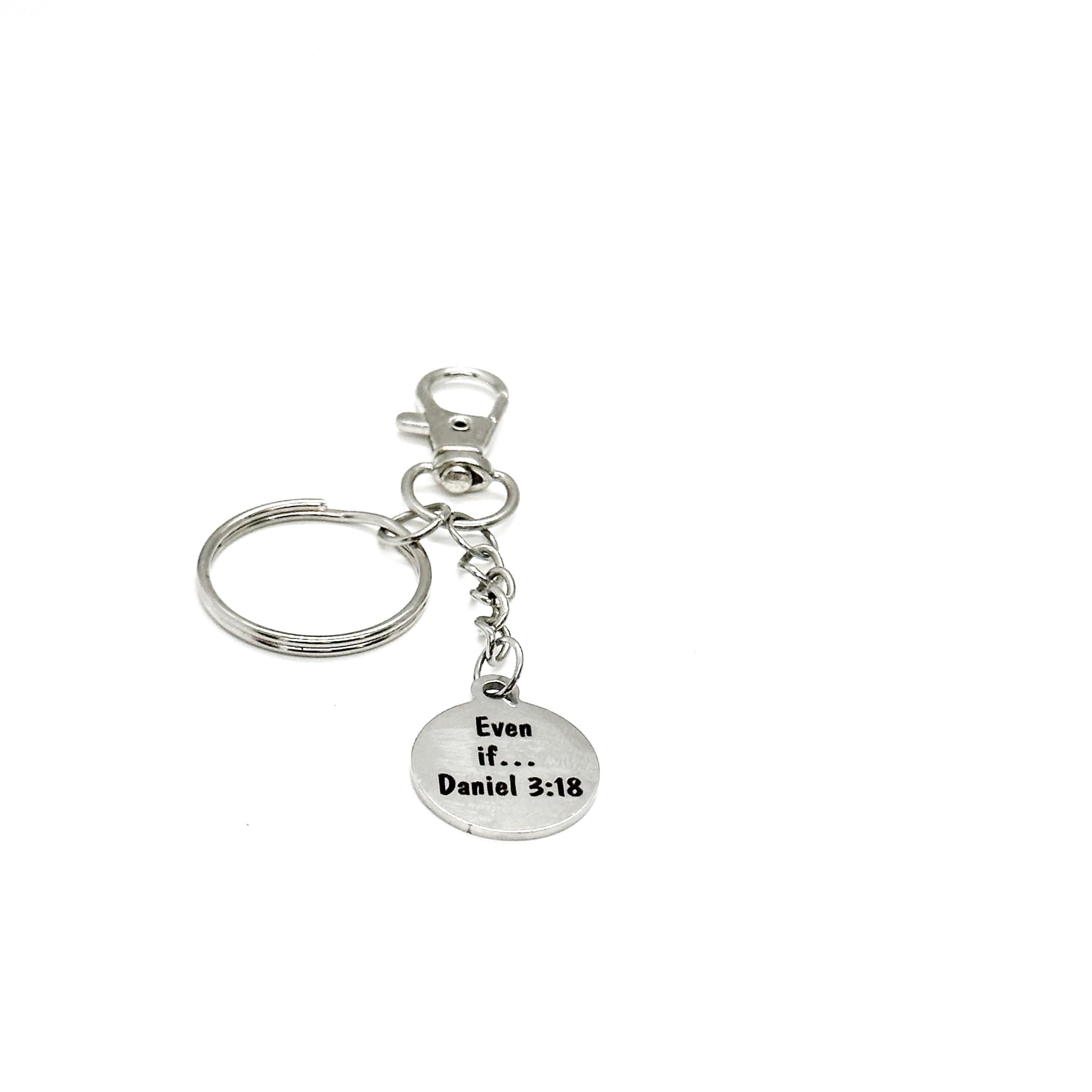 This meaningful clip-on keychain features a stainless steel engraved charm with the powerful words “Even if… Daniel 3:18”, inspired by unwavering faith and trust in God regardless of circumstance.
