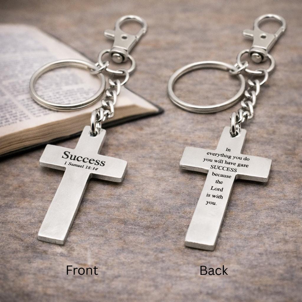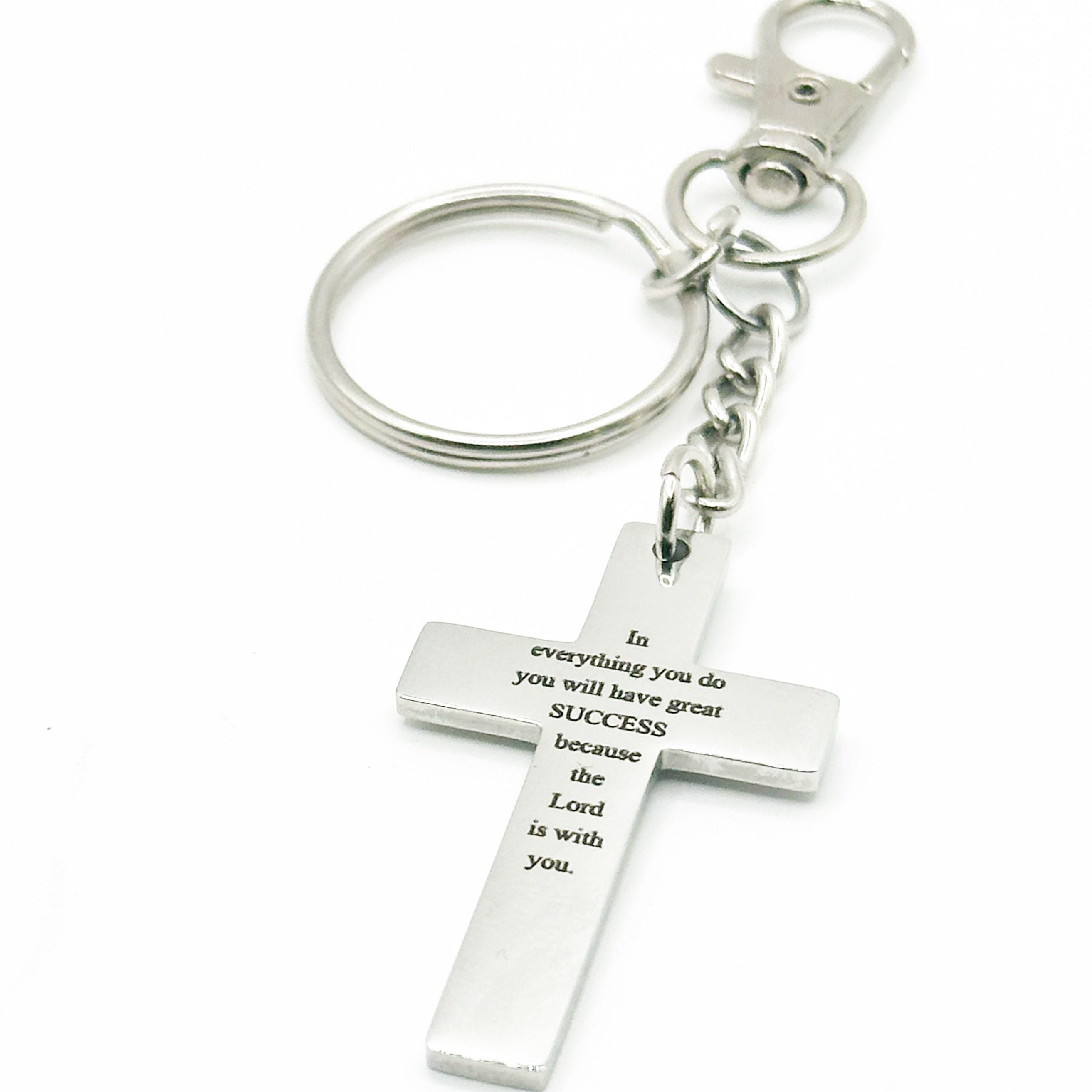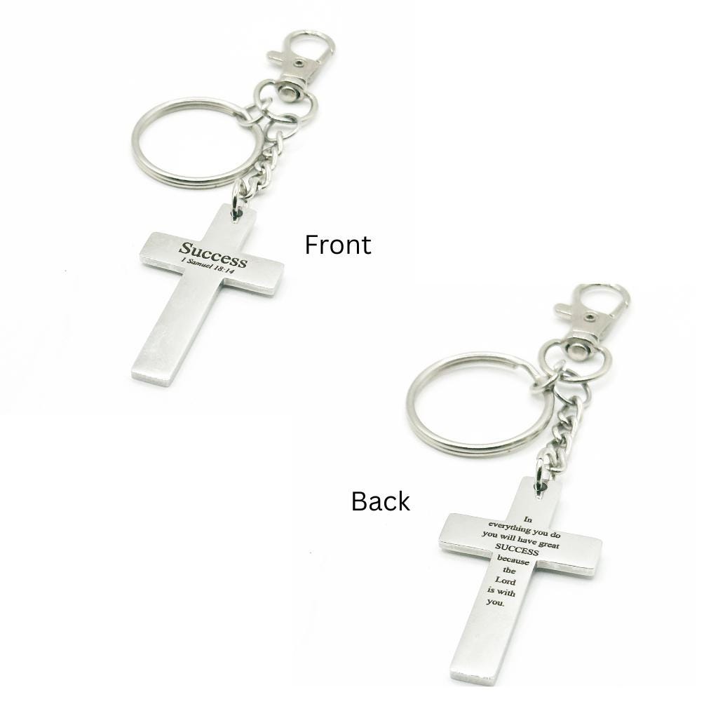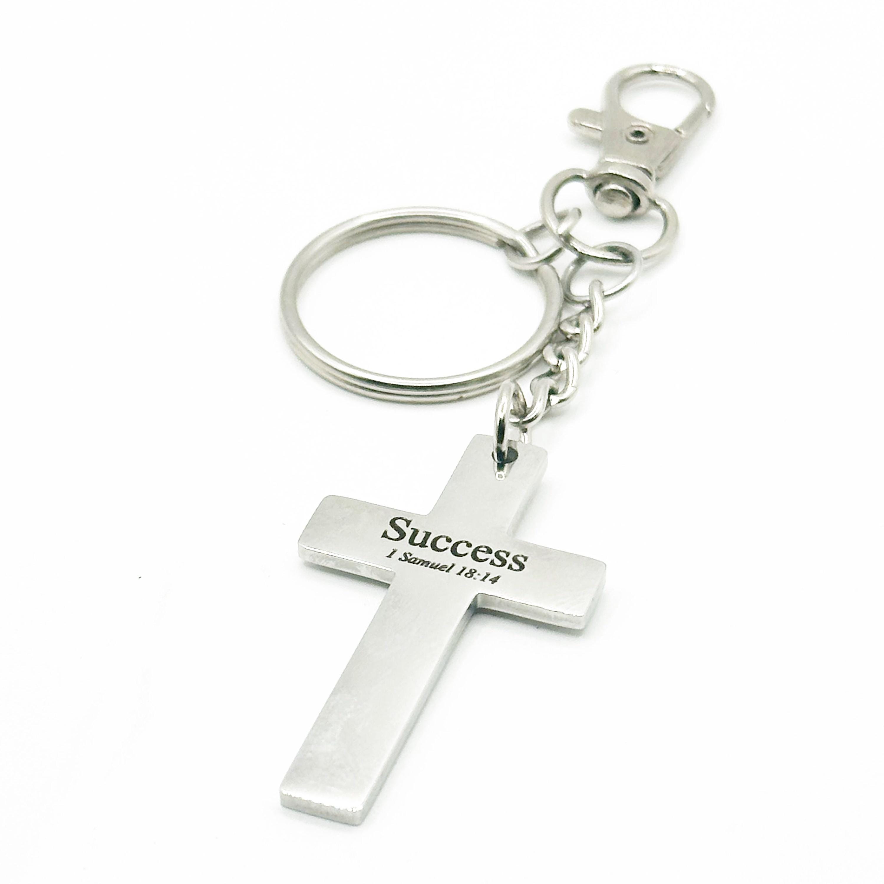 Carry a faith filled reminder with you every day with this engraved Success Scripture Cross Clip On Keychain from JKCE Designs. This meaningful stainless steel cross features a message on both sides, making it a beautiful daily encouragement for school work travel and everyday life.