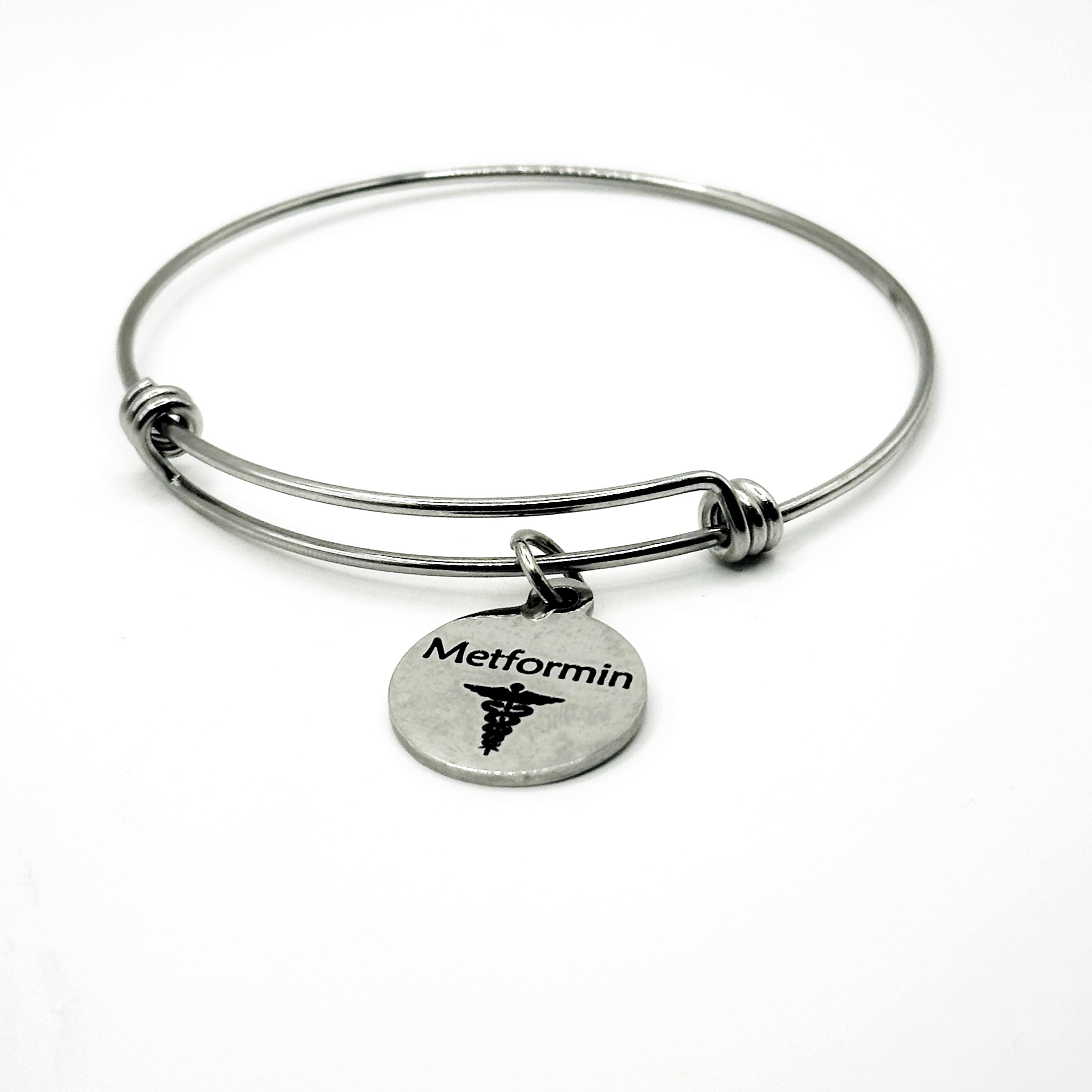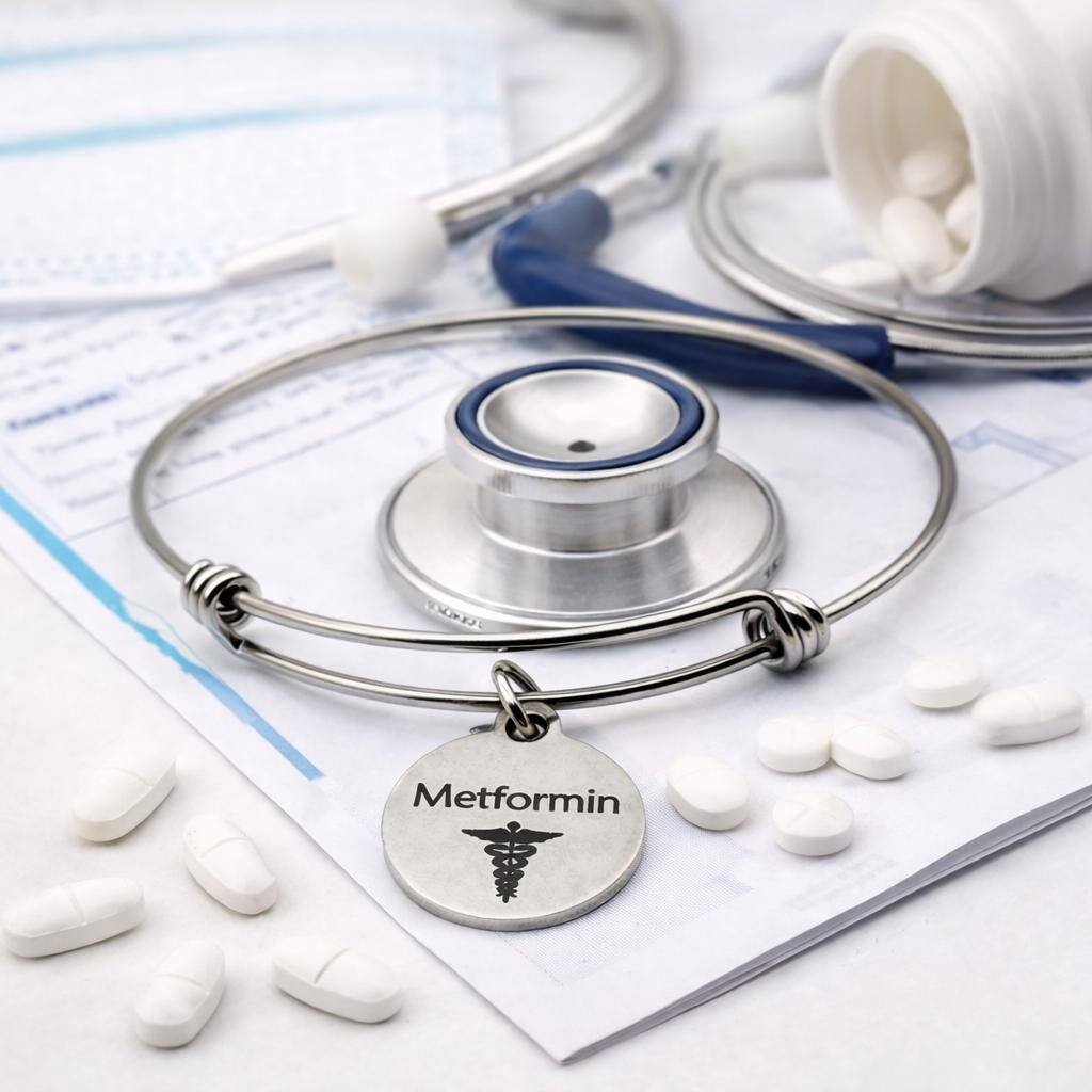 This stainless steel medical charm bracelet is designed to clearly display Metformin, offering a simple and reliable way to communicate essential medication information.