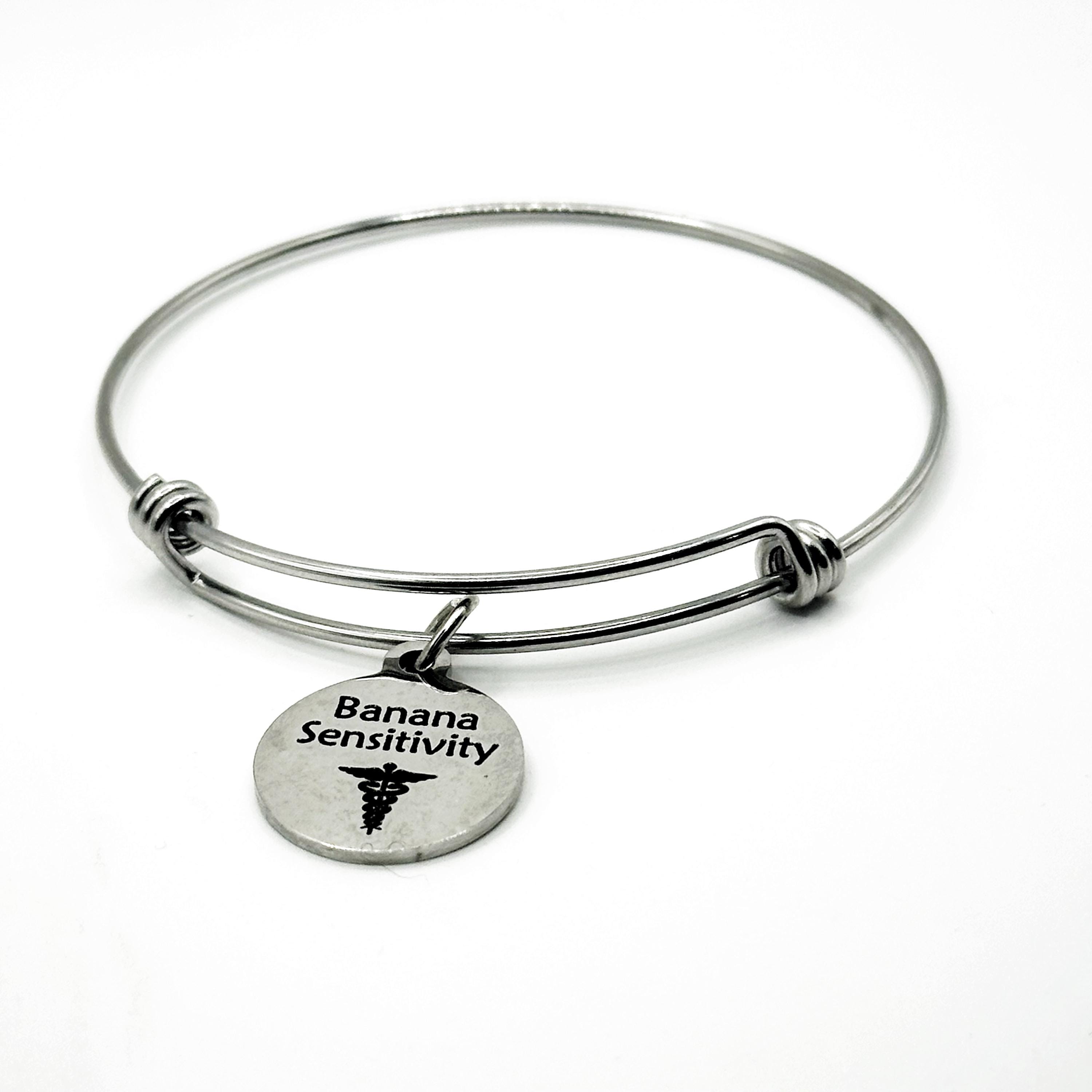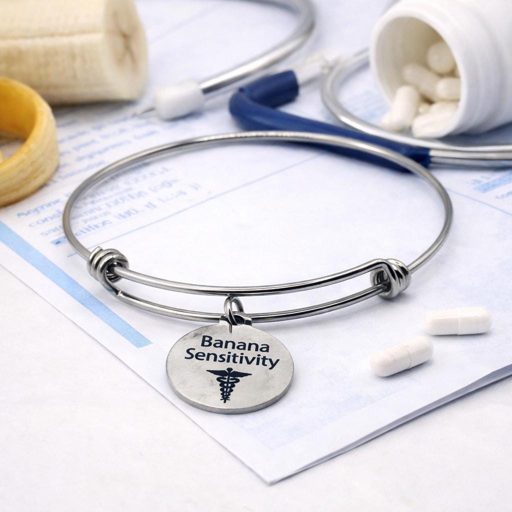 This stainless steel medical alert charm bracelet is designed to clearly display Banana Sensitivity, providing a simple and discreet way to communicate important food sensitivity information.