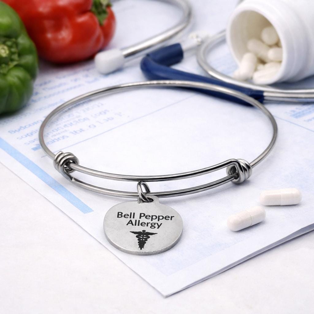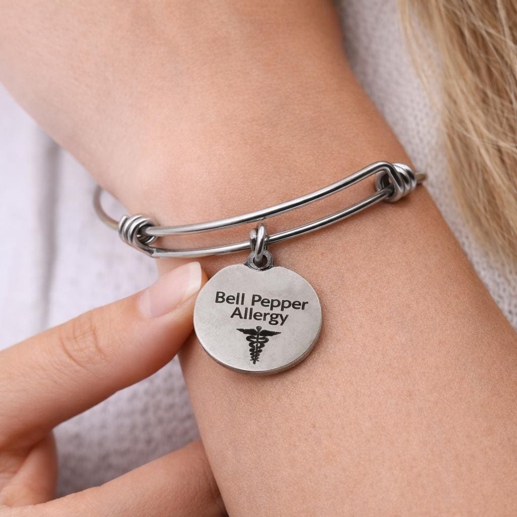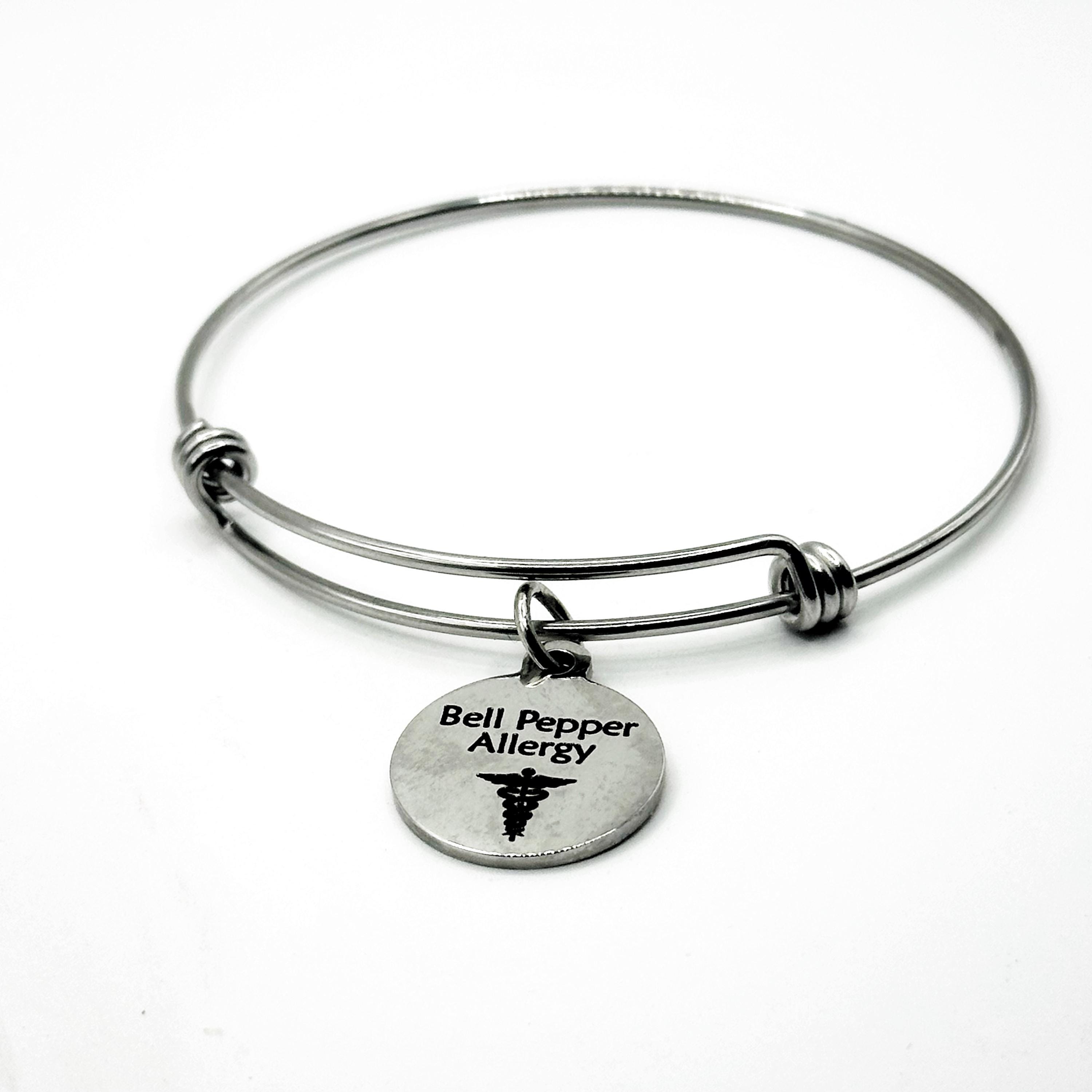 This stainless steel medical alert charm bracelet is designed to clearly display Bell Pepper Allergy, offering a simple and reliable way to communicate important food allergy information.