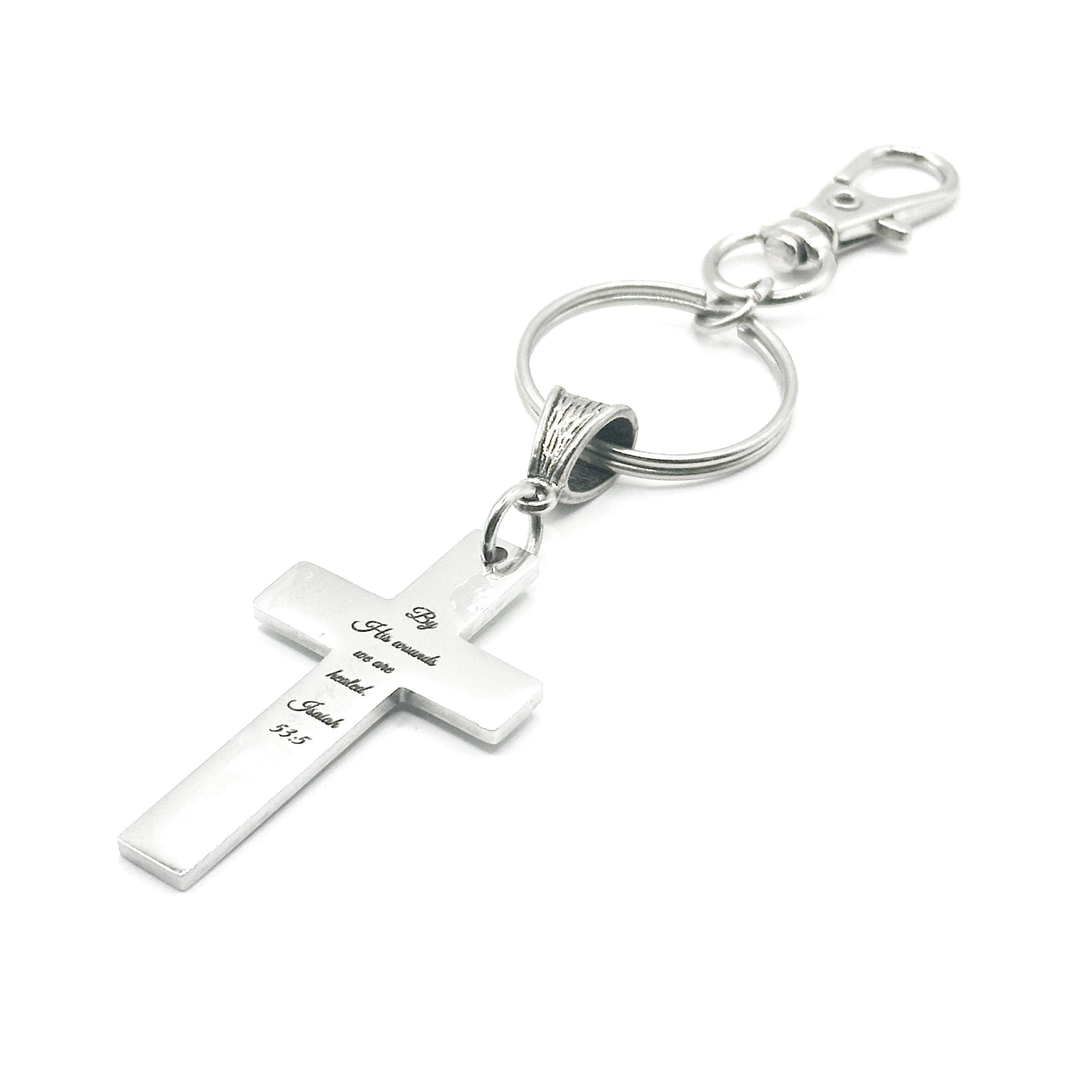 Carry a powerful reminder of God’s healing promise wherever you go. This faith-forward keychain features a stainless steel cross charm engraved with Isaiah 53:5—simple, meaningful, and made to encourage you through everyday life.