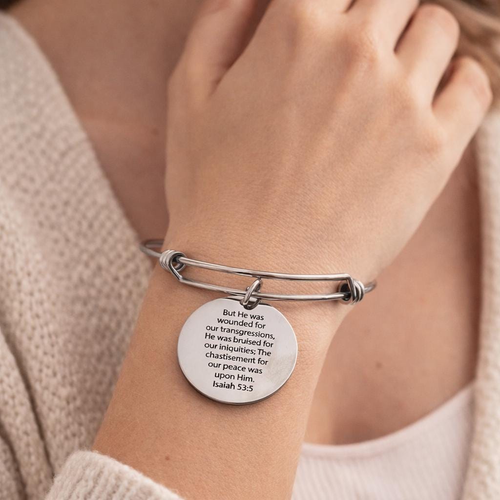 This faith-forward bracelet features a stainless steel engraved charm displaying the powerful words of Isaiah 53:5, a reminder of Christ’s sacrifice and the peace found through Him. Designed to be worn daily, this piece offers both meaning and durability in a timeless style.