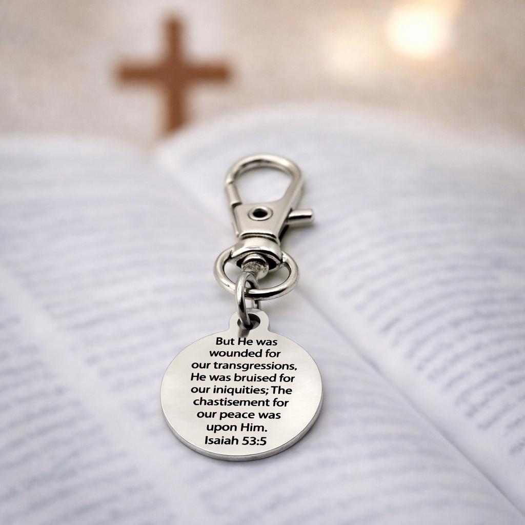 Carry a powerful reminder of Christ’s sacrifice wherever you go with this Isaiah 53:5 clip on charm from JKCE Designs. Thoughtfully engraved on durable stainless steel, this meaningful piece serves as a daily reflection of faith, redemption, and peace found in Him.