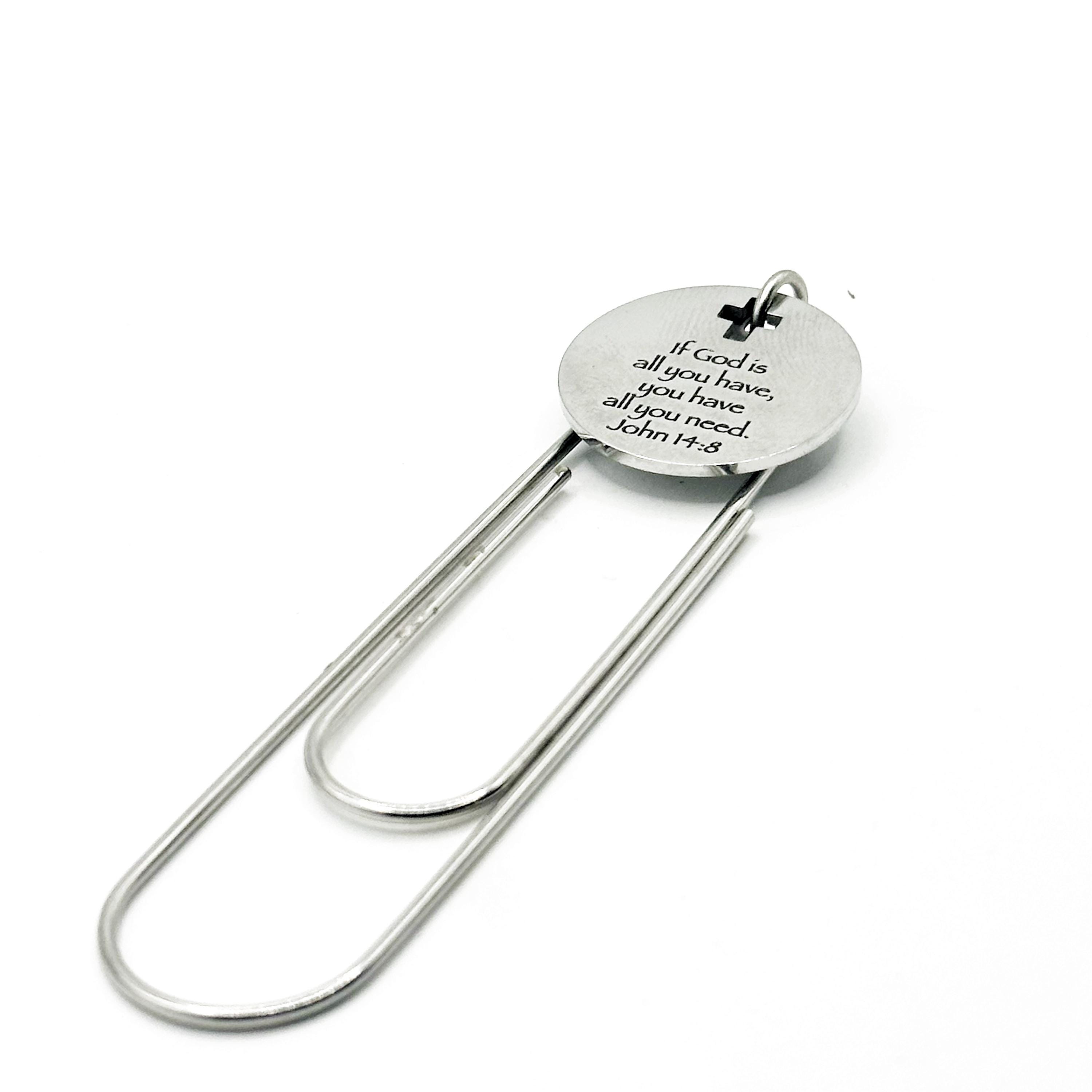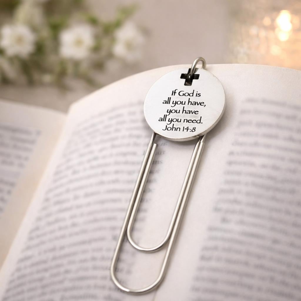 This faith-inspired paperclip bookmark is a meaningful reminder of trust and contentment in God alone. Designed to rest gently between the pages of your Bible, devotional, or favorite book, it offers daily encouragement with every chapter you read.