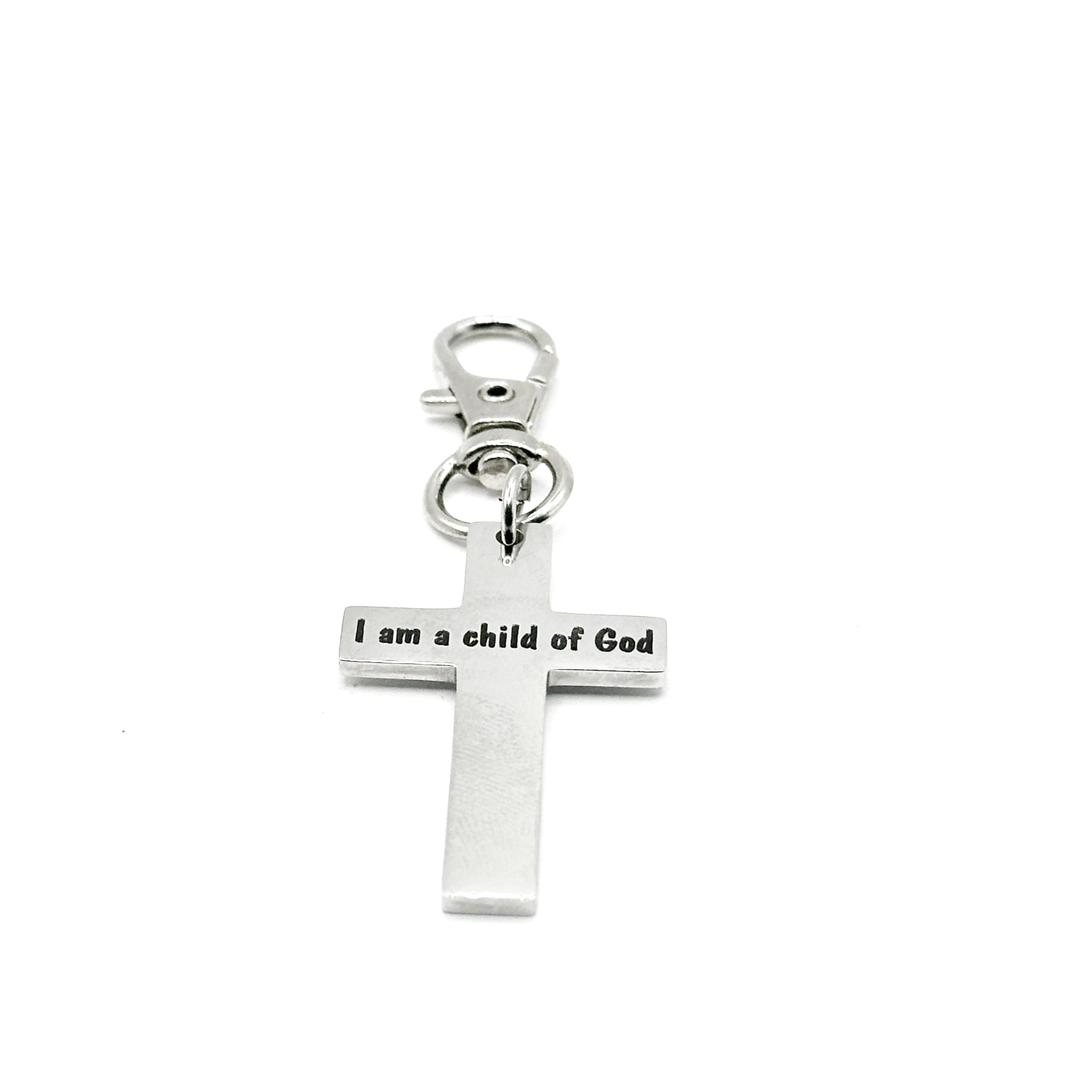 Carry a daily reminder of who you are in Christ with this I am a child of God stainless steel cross clip on charm from JKCE Designs. This faith forward piece features the exact engraving I am a child of God on a polished stainless steel cross measuring approximately 1 5/8 inches long by 1 inch wide.