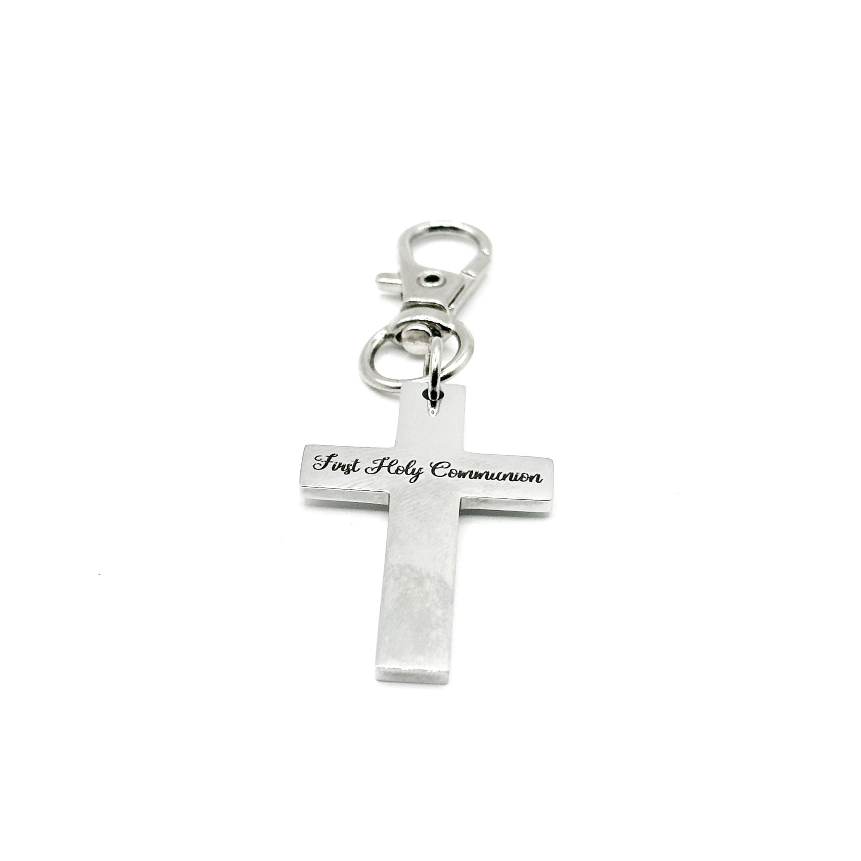 Celebrate a sacred milestone with this First Holy Communion stainless steel cross clip on charm from JKCE Designs. The polished cross is engraved with the exact words First Holy Communion, creating a meaningful keepsake to honor this special day.