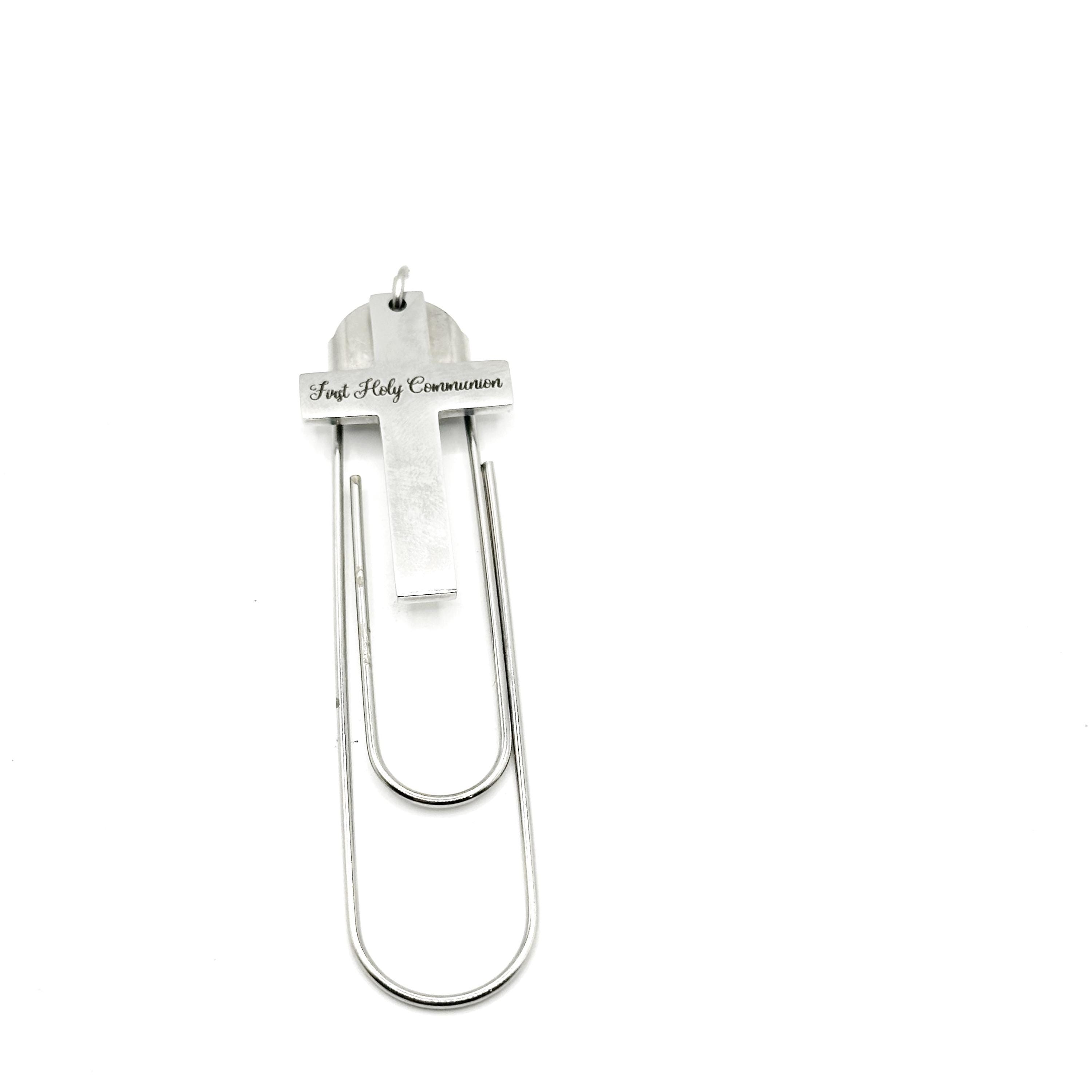 Mark a sacred milestone with this First Holy Communion stainless steel cross paperclip bookmark from JKCE Designs. The polished cross is engraved with the exact words First Holy Communion, creating a meaningful keepsake to celebrate this special day of faith.