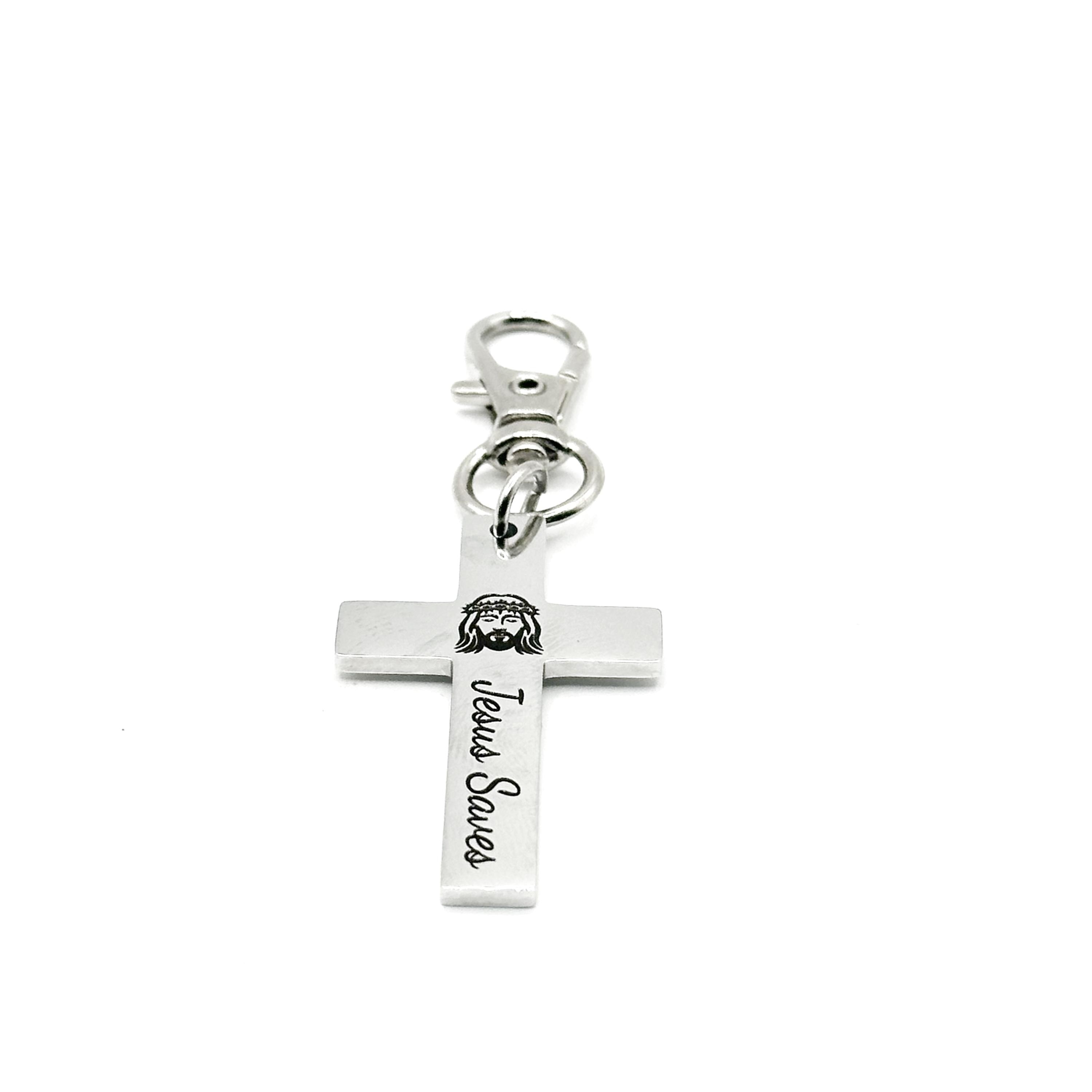 Carry a bold reminder of faith wherever you go. This Jesus Saves Cross Clip On Charm is crafted from stainless steel and engraved exactly as shown with “Jesus Saves.” The cross measures approximately 1 5/8 inches long by 1 inch wide and is attached to a durable 32mm alloy lobster clasp for secure clipping.
