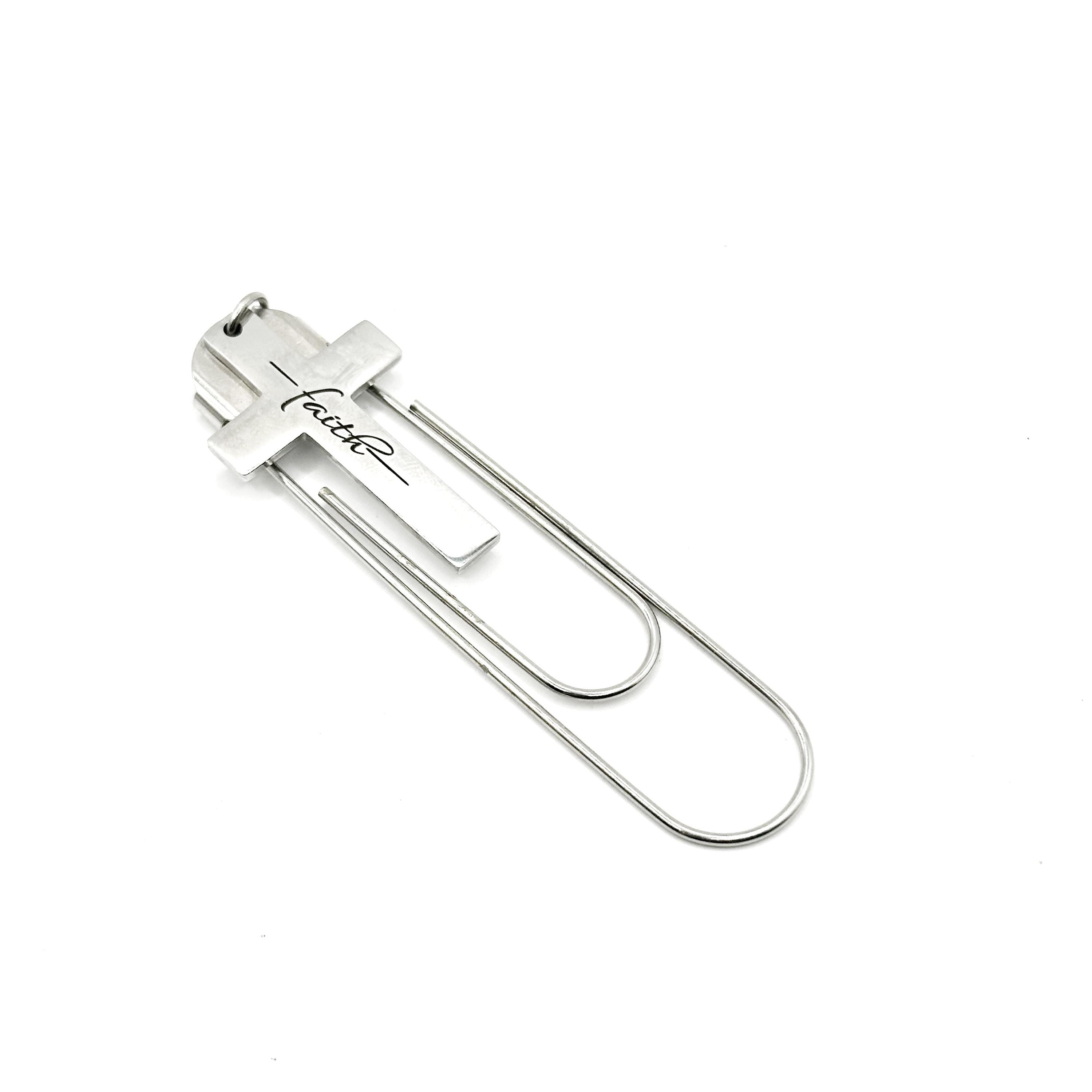 Mark your place with a meaningful reminder of what matters most. This Faith cross charm paperclip bookmark features a stainless steel cross charm engraved with the word Faith, measuring approximately 1 5/8 inches long by 1 inch wide. The charm is securely attached to a 3 1/2 inch stainless steel paperclip bookmark.