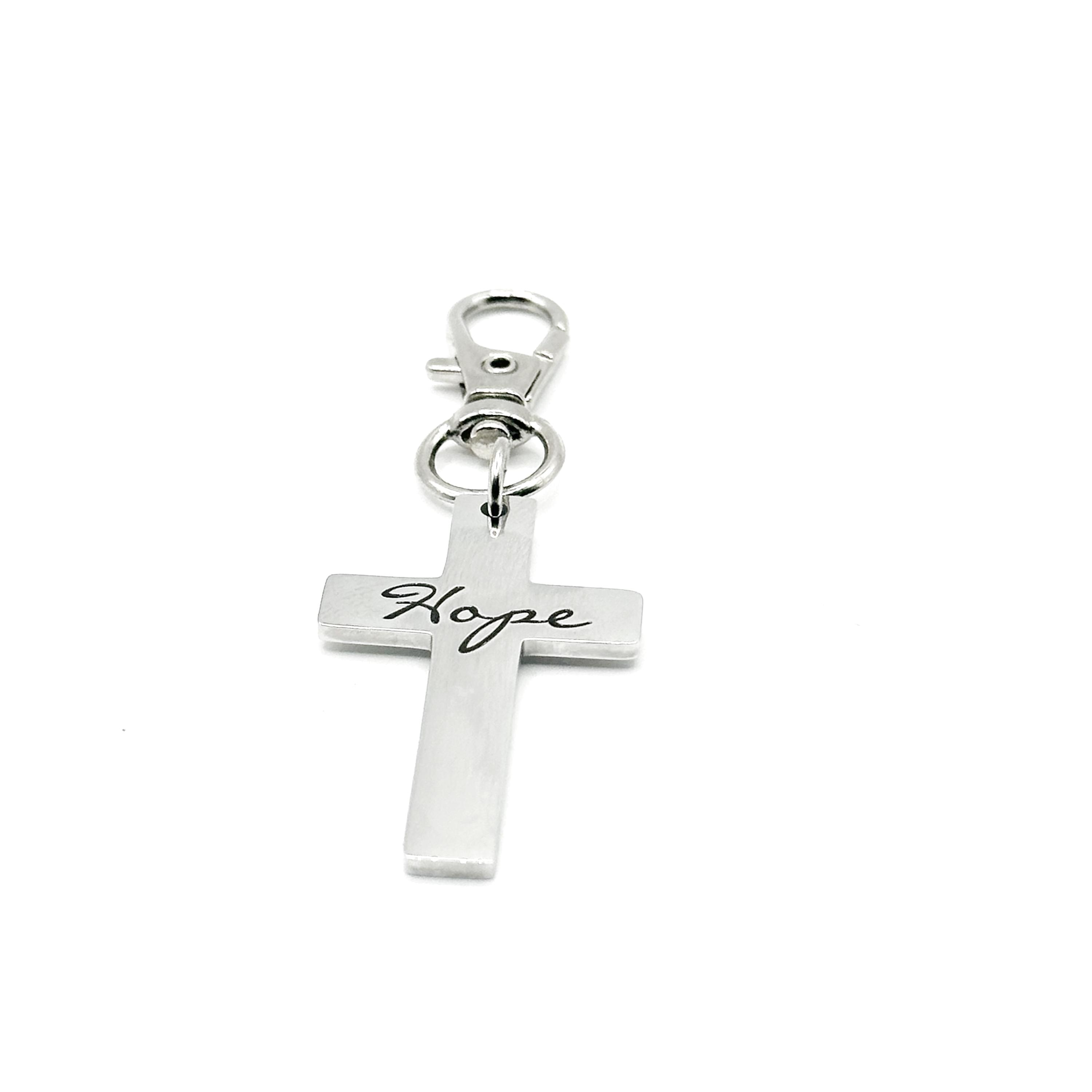 Carry a simple yet powerful reminder of faith wherever you go. The Hope Cross Clip On Charm by JKCE Designs is crafted from stainless steel and engraved with the word Hope in an elegant script. Measuring approximately 1 5/8 inches long by 1 inch wide, this cross charm is attached to a 32mm alloy lobster clasp for secure and easy clipping.