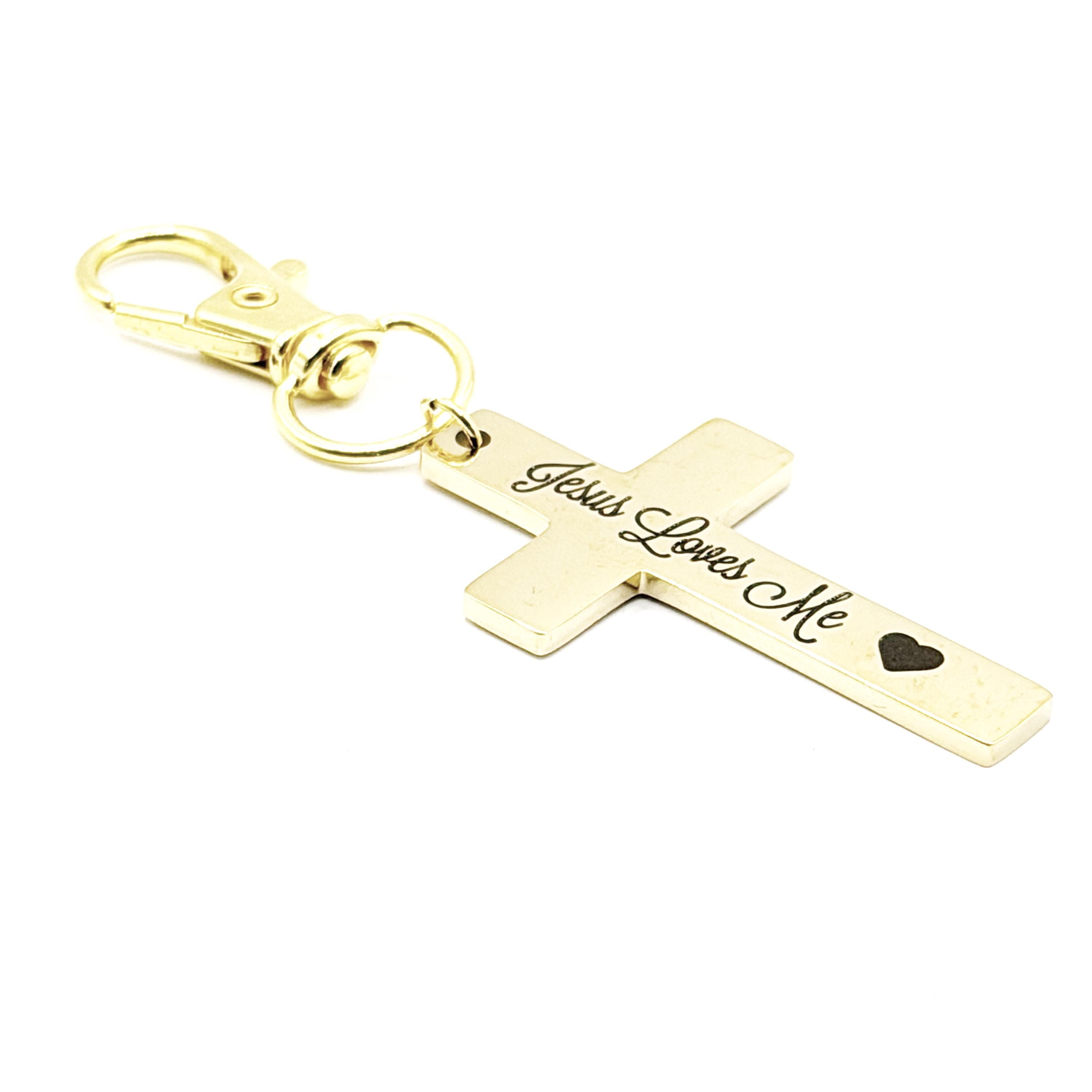 Carry a beautiful reminder of faith wherever you go with this Jesus Loves Me cross clip on charm. Crafted from gold-plated stainless steel, this 1 5/8 inch long by 1 inch wide cross features the heartfelt engraving Jesus Loves Me in an elegant script. The charm is attached to a 32mm alloy lobster clasp, making it easy to clip onto purses, backpacks, keyrings, or other accessories for daily inspiration.