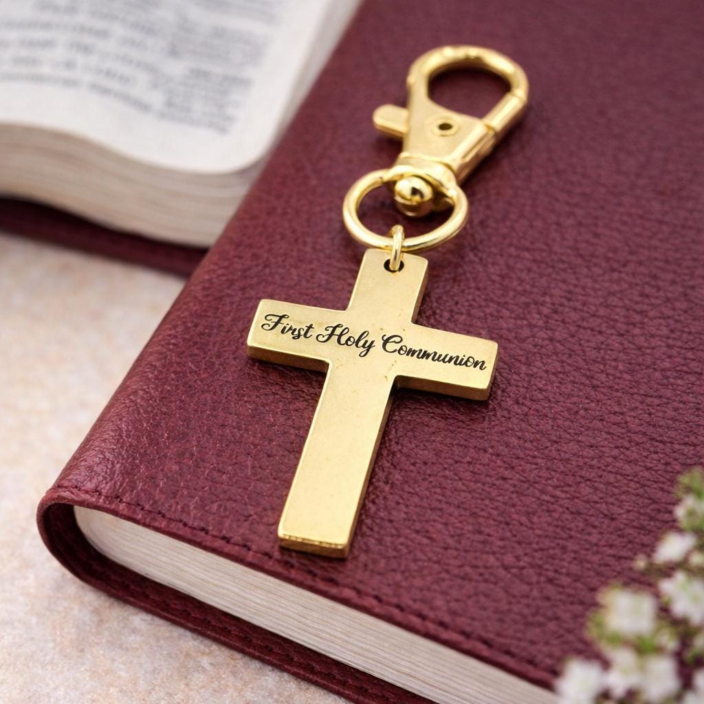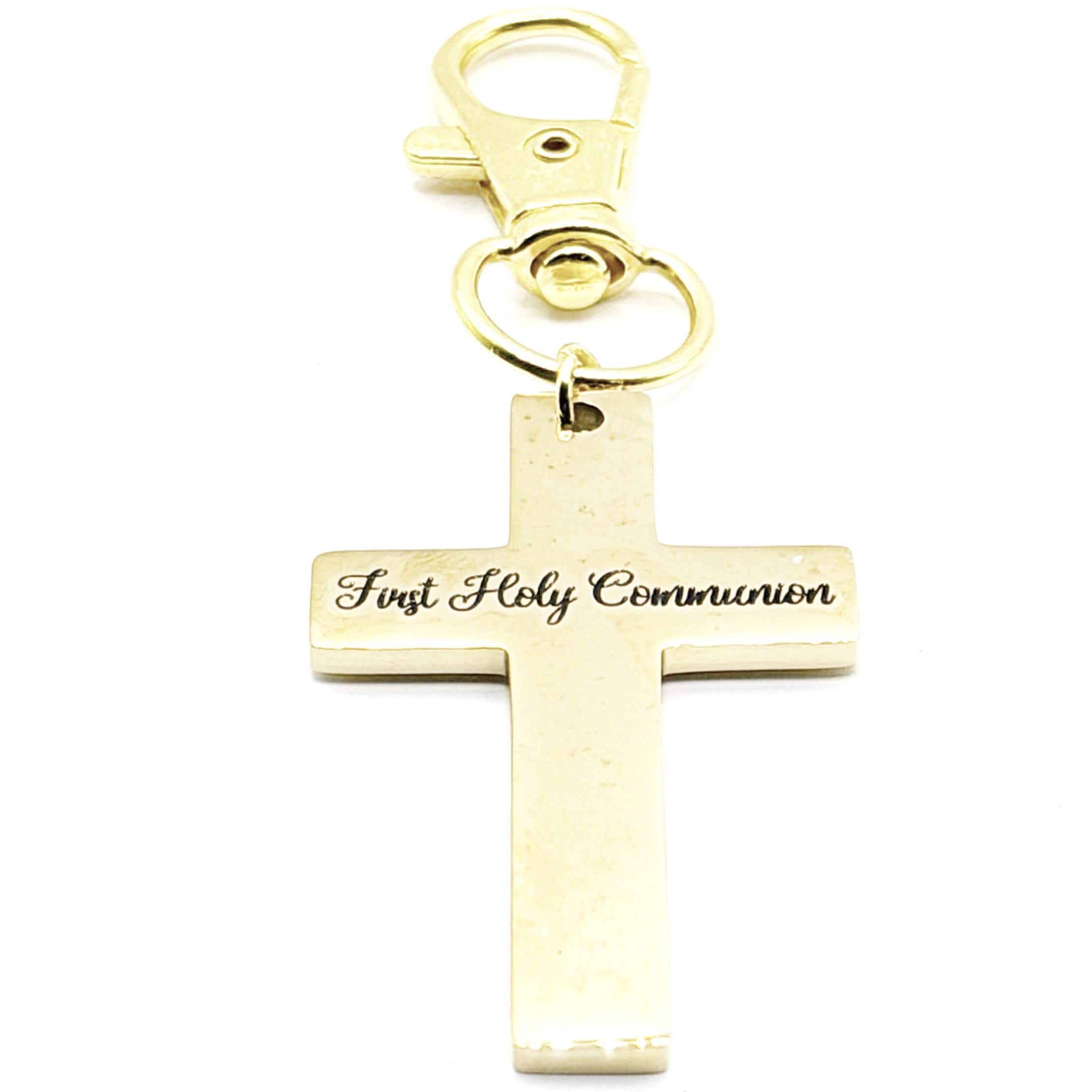 Celebrate a sacred milestone with this First Holy Communion gold-plated stainless steel cross clip on charm from JKCE Designs. The polished cross is engraved with the exact words First Holy Communion, creating a timeless keepsake to honor this meaningful day of faith.