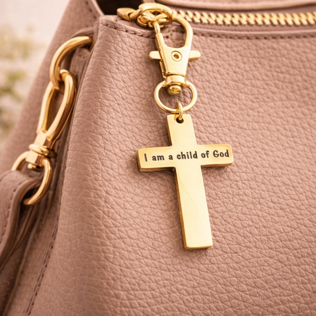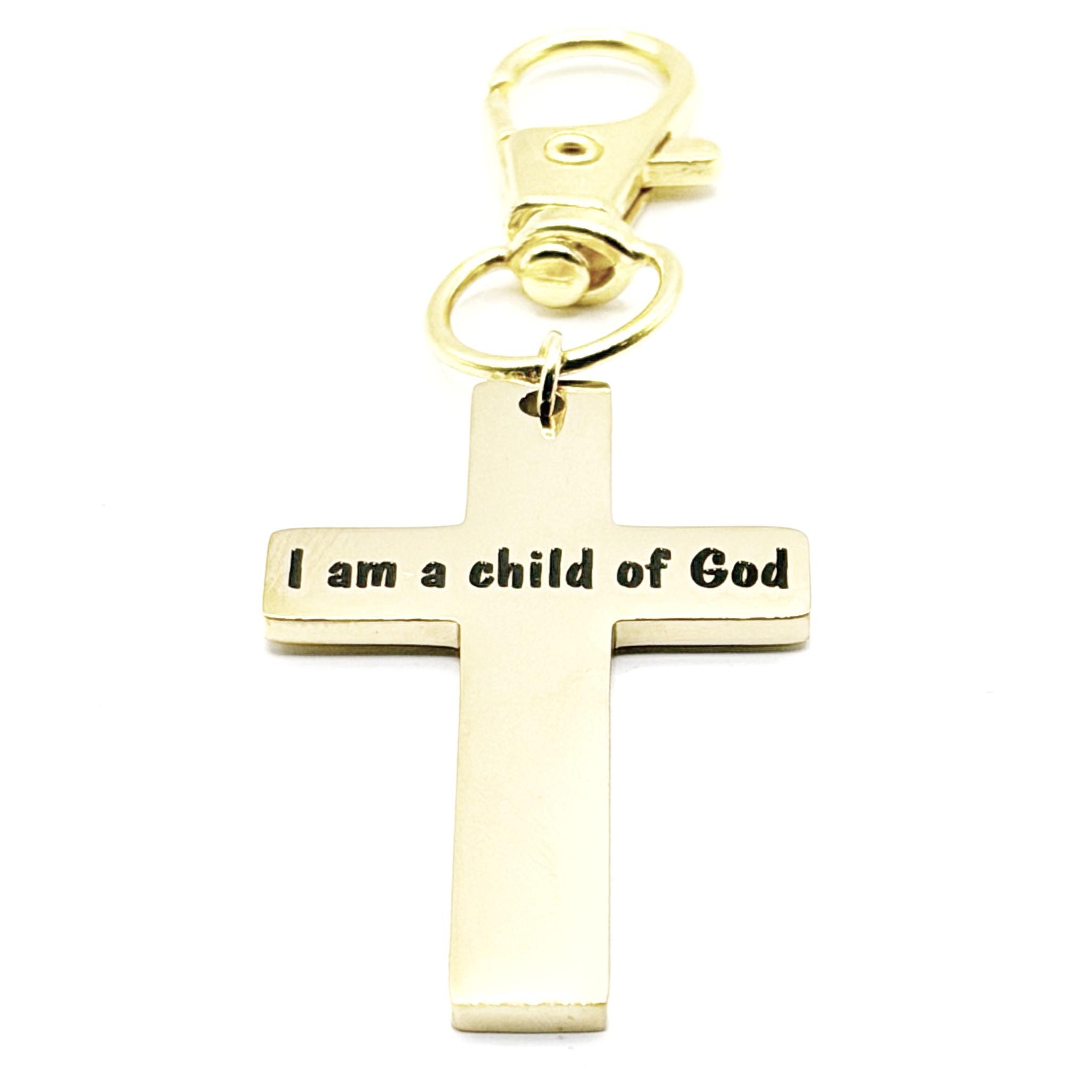 Carry a beautiful reminder of your identity in Christ with this I am a child of God gold plated cross clip on charm from JKCE Designs. This piece features a gold plated stainless steel cross charm engraved exactly with I am a child of God and paired with a 32mm alloy lobster clasp for secure attachment.