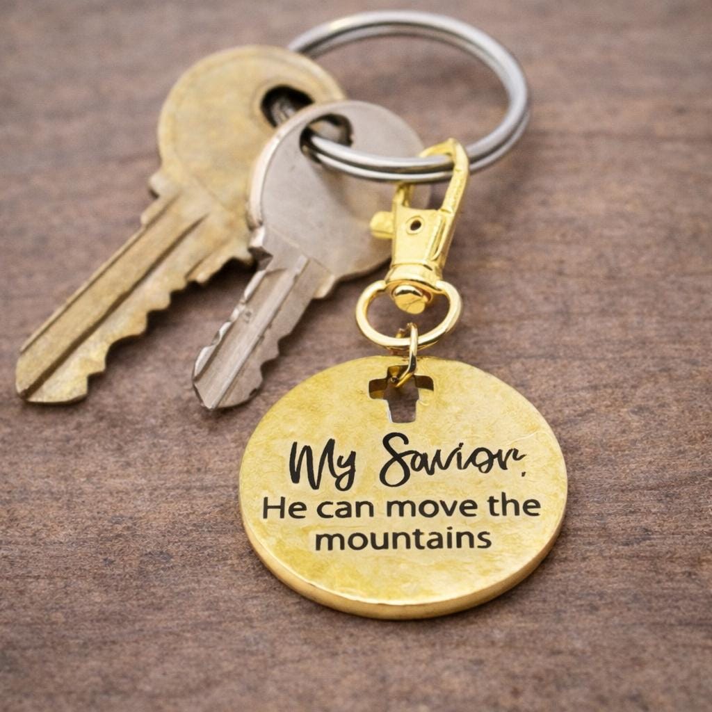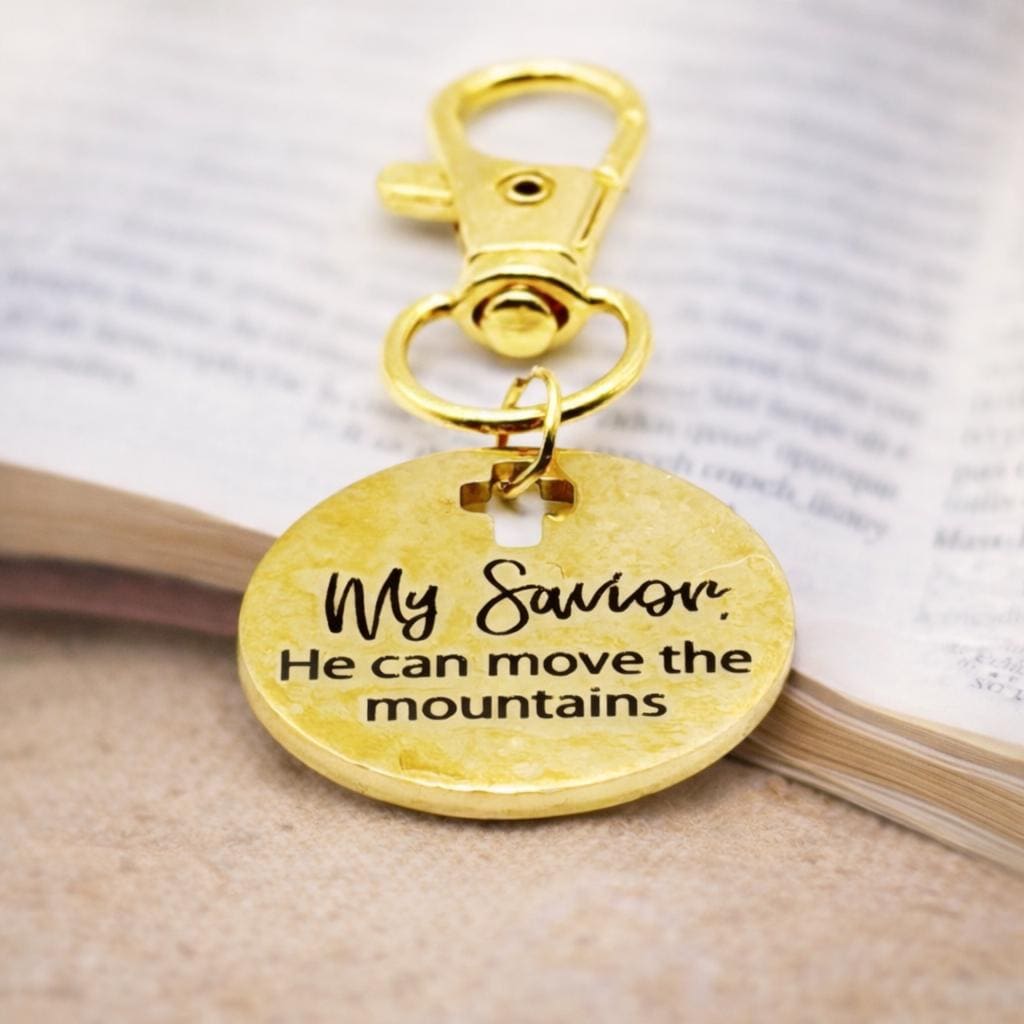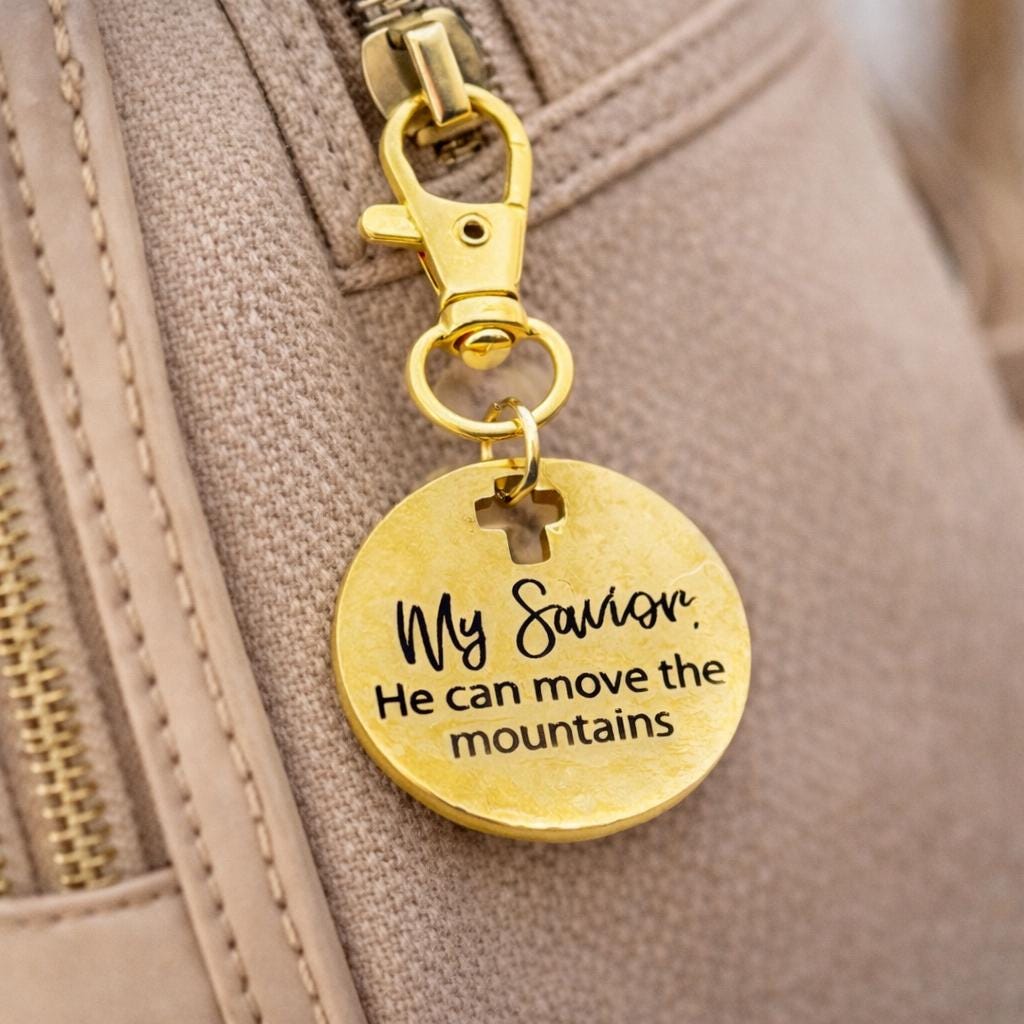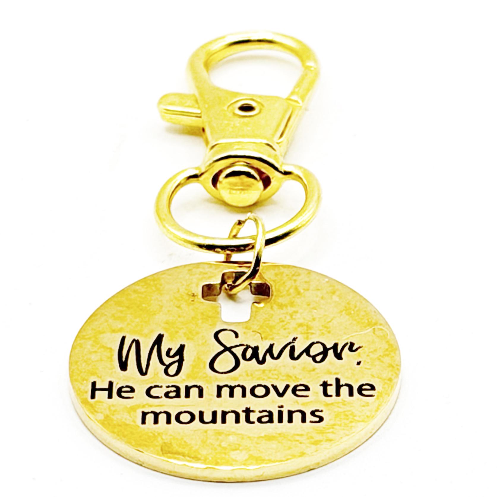 Carry a powerful reminder of faith wherever you go. This gold plated stainless steel clip on charm features the engraving My Savior He can move the mountains and includes a cross cutout detail where the charm connects to the clasp. Measuring approximately 25mm, it is attached to a durable 32mm alloy lobster clasp, making it easy to clip onto a purse, backpack, keyring, or zipper pull.