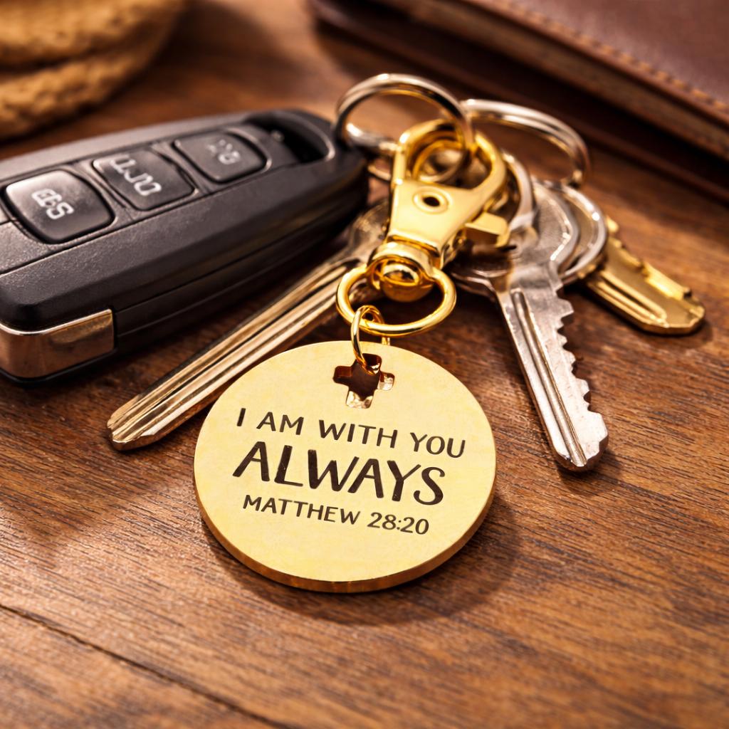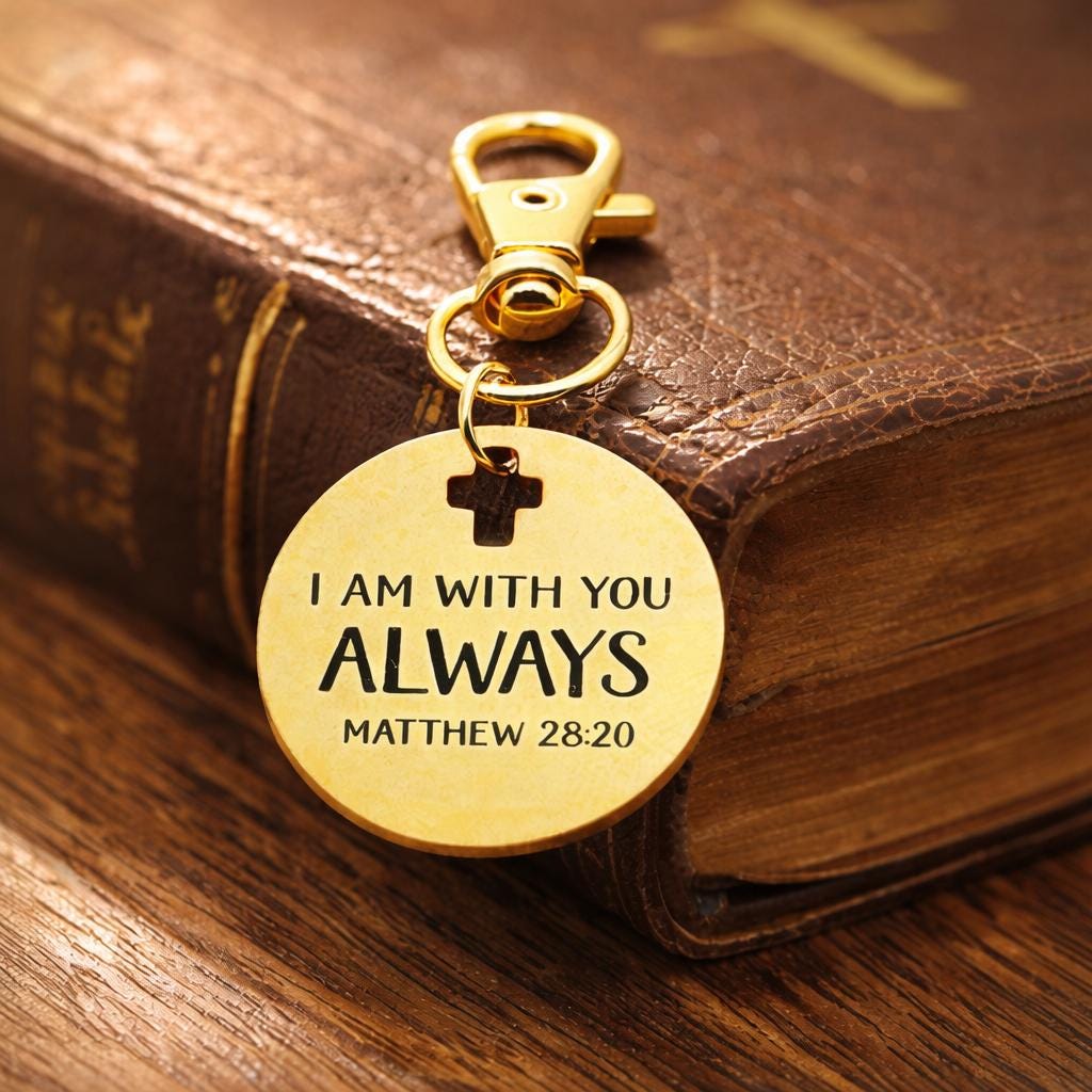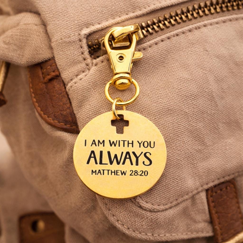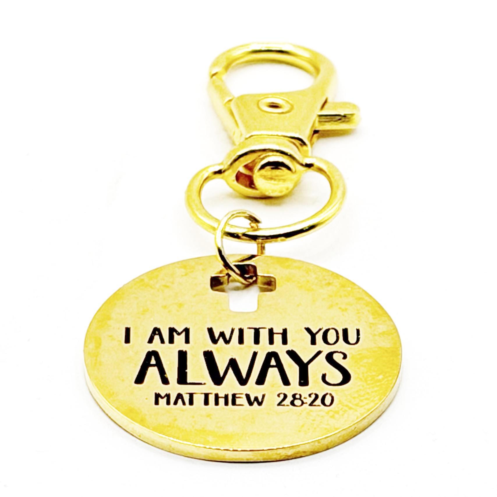 Carry a daily reminder of faith and comfort wherever you go. This gold plated stainless steel clip on charm is engraved with the reassuring words I am with you always Matthew 28:20. Designed on a 25mm round charm with a cross cutout at the attachment point, it connects securely to a 32mm alloy lobster clasp for easy clipping to keys, purses, backpacks, or zippers.