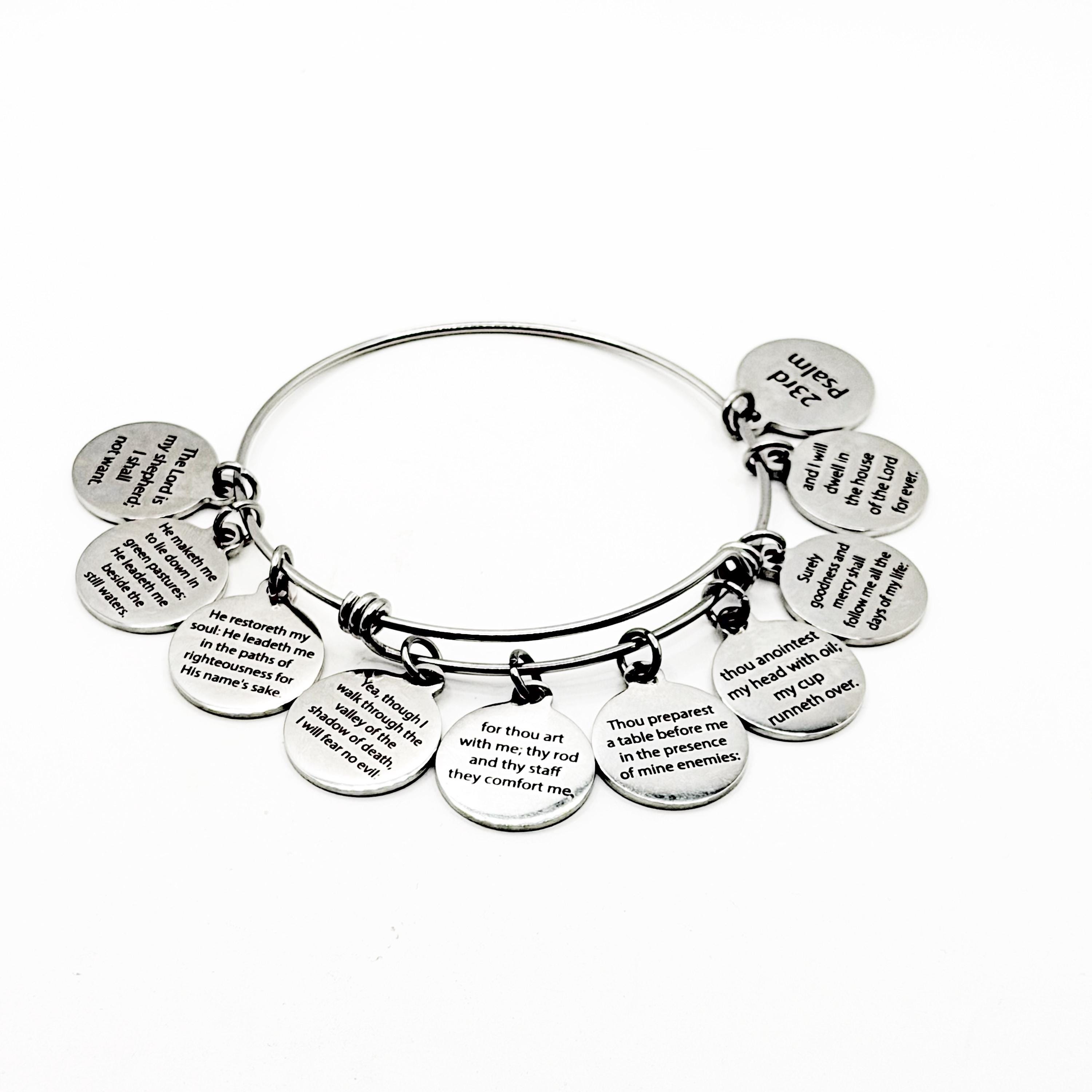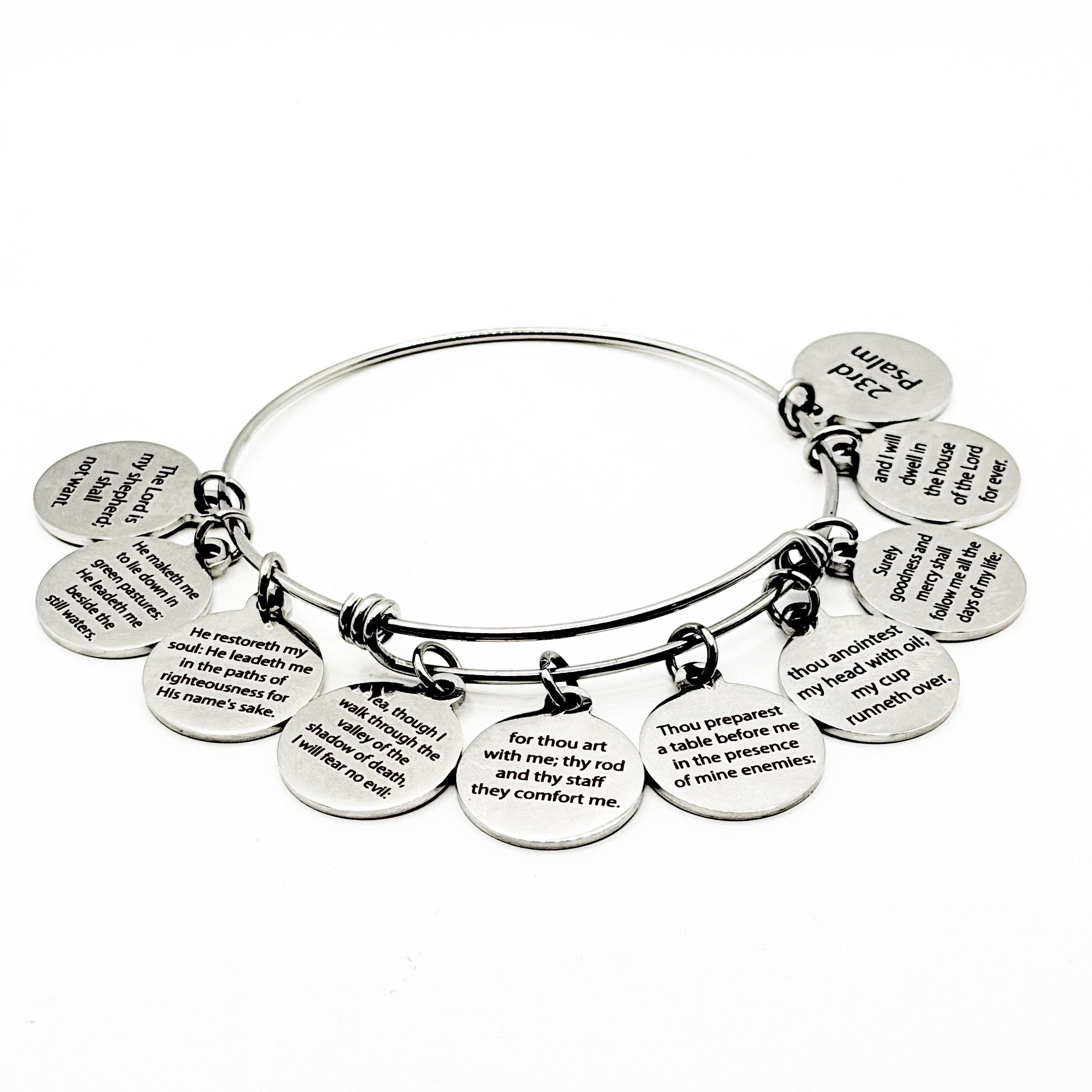 Carry the timeless words of Psalm 23 with you each day with this beautifully engraved 23rd Psalm bracelet from JKCE Designs. This stainless steel expanding bangle features 10 engraved 19mm stainless steel charms, each displaying a portion of the beloved scripture.