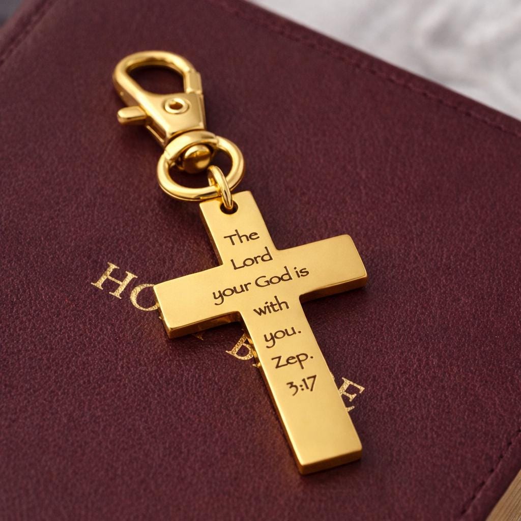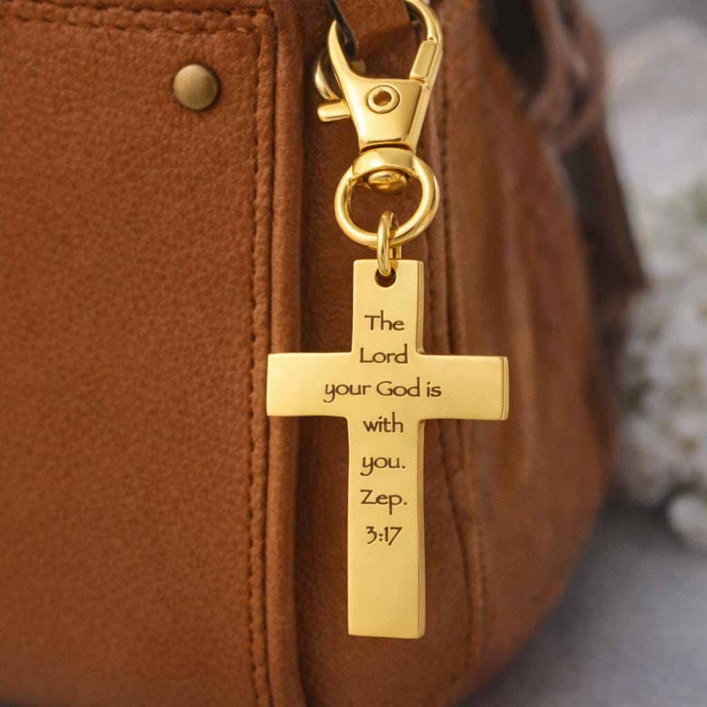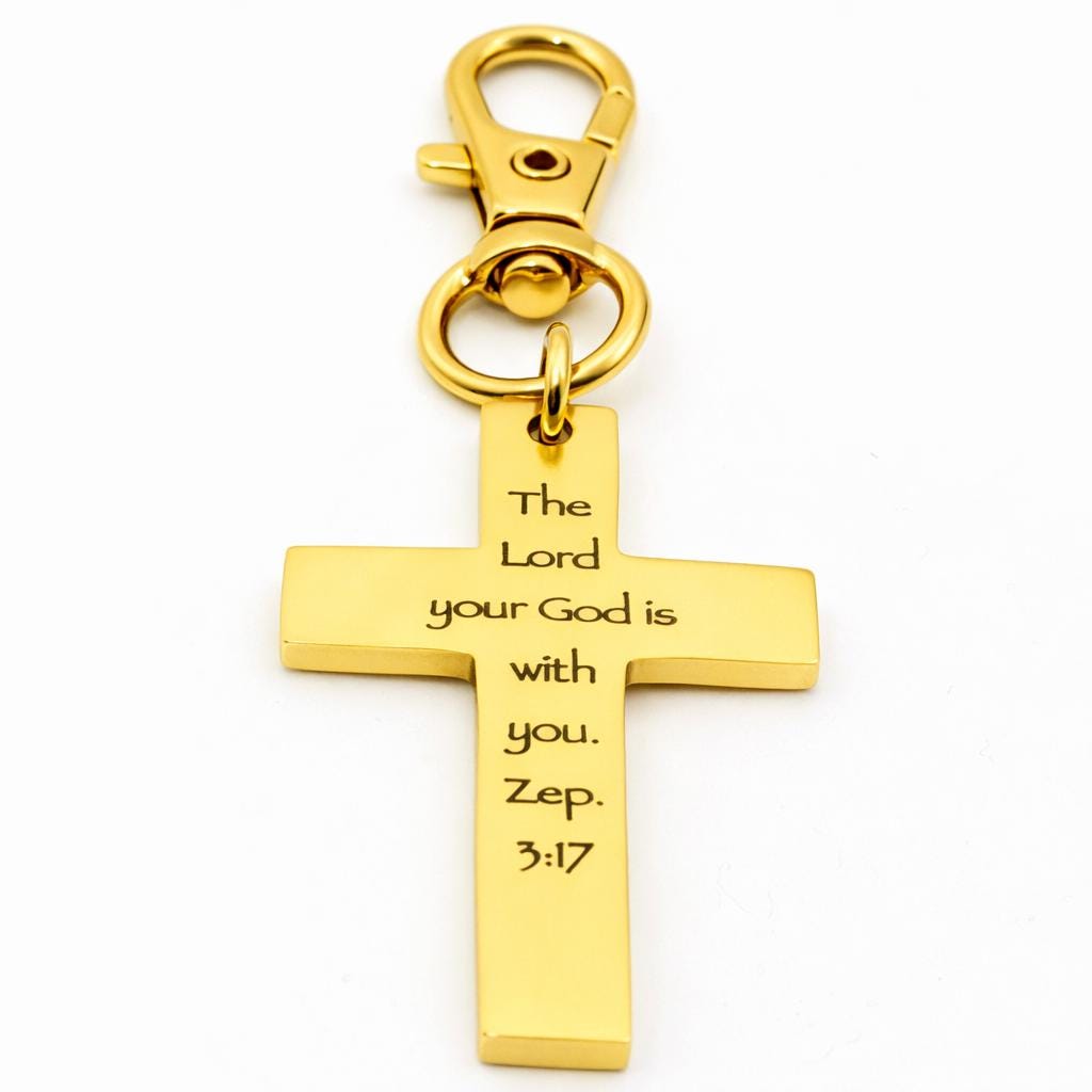 Carry a daily reminder of God’s presence wherever you go. This gold-plated stainless-steel cross clip-on charm features the engraved message, “The Lord your God is with you. Zep. 3:17” in the exact layout shown. Measuring 1 5/8 inches long by 1 inch wide, the cross is paired with a 32mm alloy lobster clasp for secure and easy attachment.