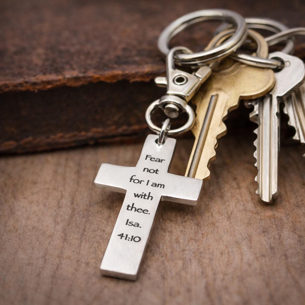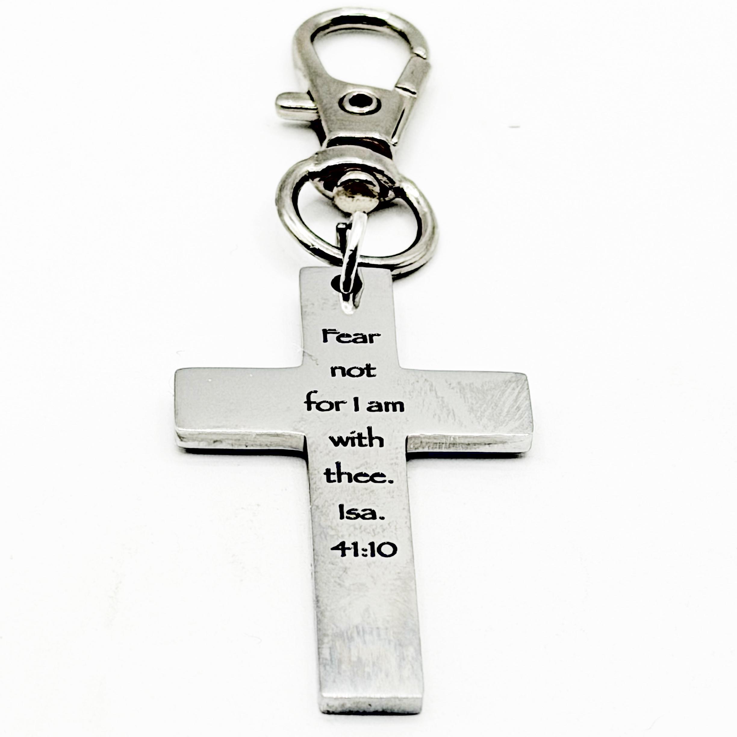 Carry a powerful reminder of God’s presence wherever you go with this stainless steel cross clip on charm engraved with “Fear not for I am with thee. Isa 41:10”. Crafted from durable stainless steel, the cross measures 1 5/8 inches long by 1 inch wide and is attached to a 32mm alloy lobster clasp for easy clipping to a purse, backpack, keyring, or zipper pull. Its clean, timeless design makes it a meaningful gift for encouragement, graduation, comfort, or everyday inspiration. Stainless steel is resistant to tarnishing and designed for lasting wear. To care for your charm, simply wipe clean with a soft cloth and avoid harsh chemicals.