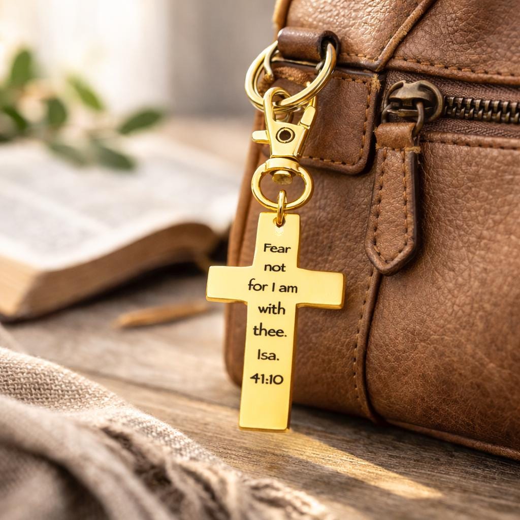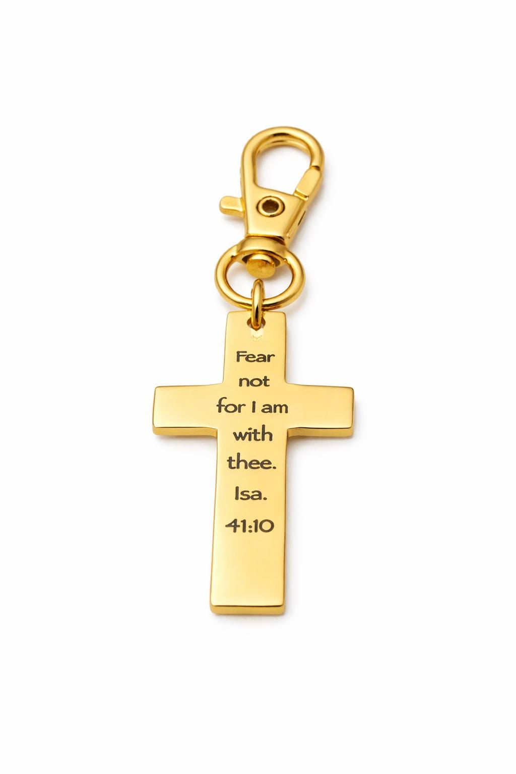 Carry a powerful reminder of God’s presence wherever you go with this gold-plated stainless steel cross clip-on charm engraved with “Fear not for I am with thee. Isa 41:10”. Crafted from durable stainless steel, the cross measures 1 5/8 inches long by 1 inch wide and is attached to a 32mm alloy lobster clasp for easy clipping to a purse, backpack, keyring, or zipper pull. Its clean, timeless design makes it a meaningful gift for encouragement, graduation, comfort, or everyday inspiration. Stainless steel is resistant to tarnishing and designed for lasting wear. To care for your charm, simply wipe clean with a soft cloth and avoid harsh chemicals.