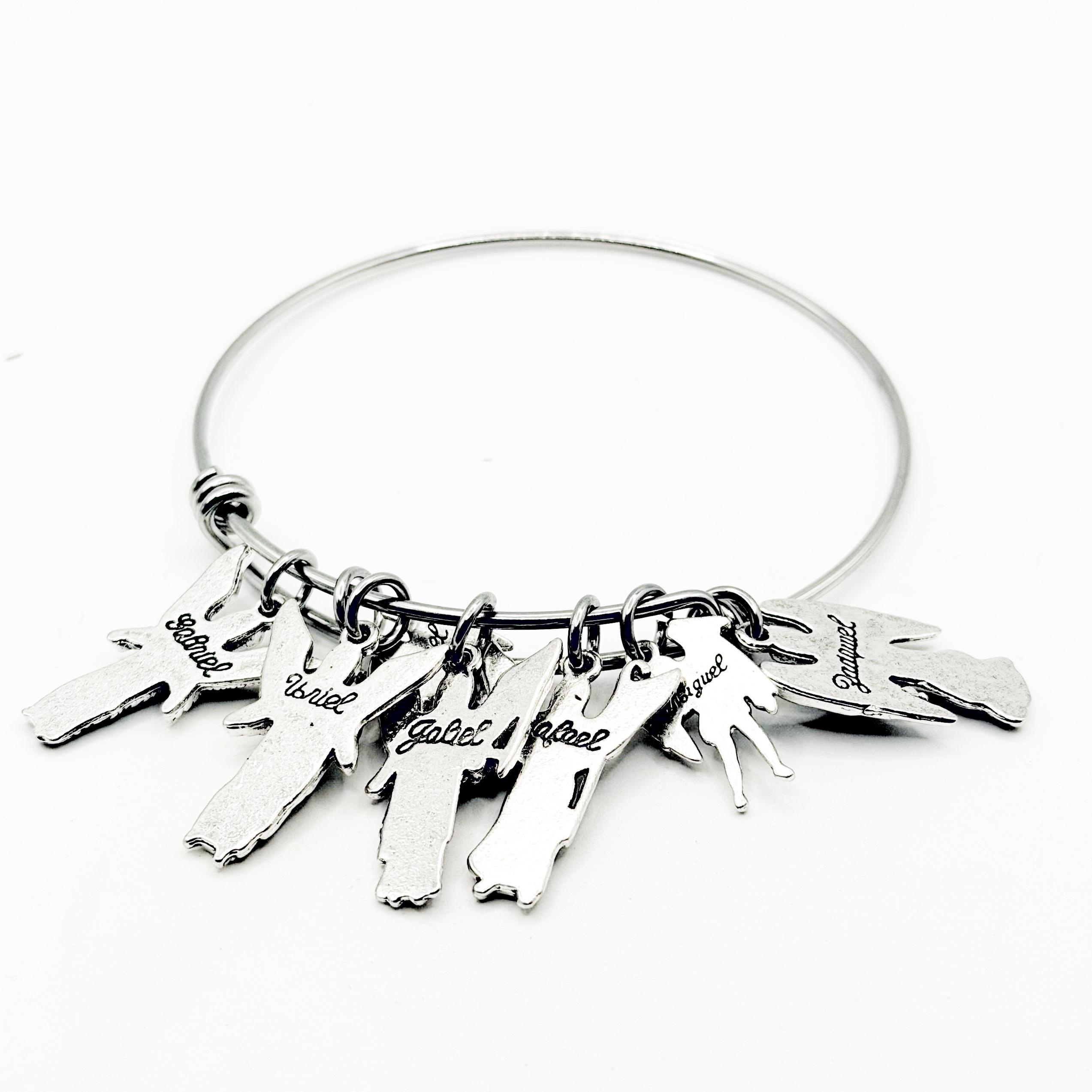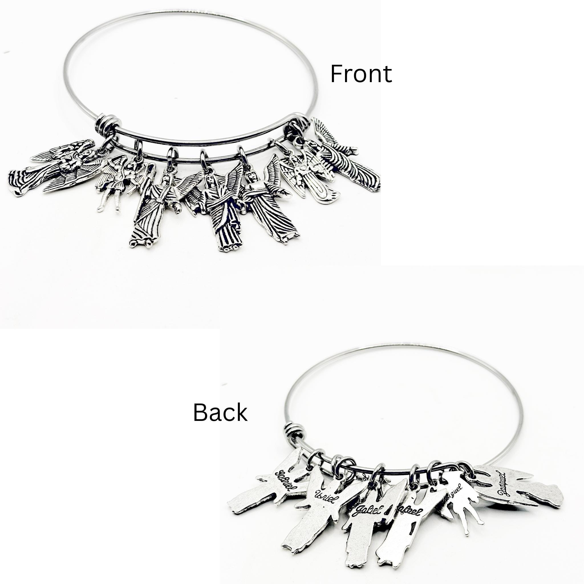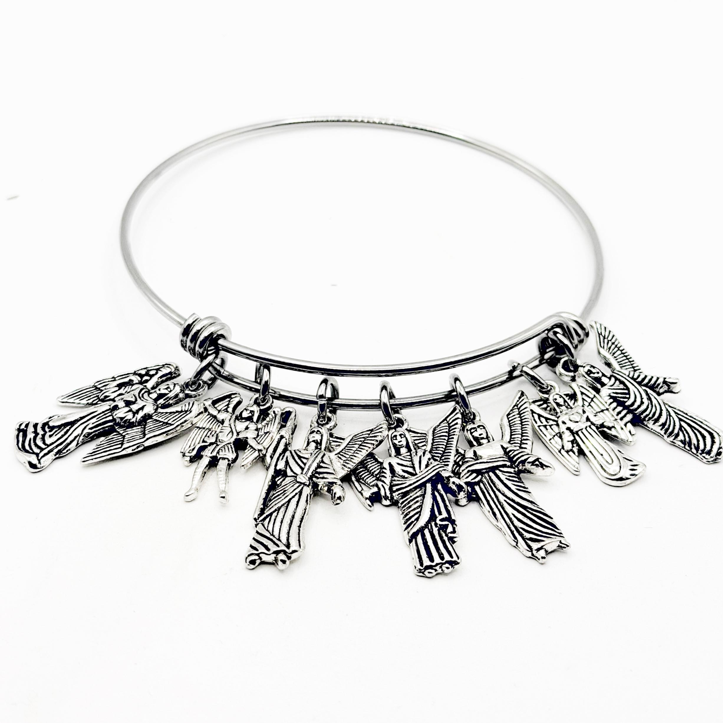 Carry the protection and virtues of the Heavenly Seven wherever you go with this meaningful Archangel charm bracelet. This silver tone bangle features detailed charms representing Michael, Gabriel, Raphael, Uriel, Jophiel, Chamuel, and Zadkiel, each symbolizing powerful spiritual attributes including justice, faith, wisdom, love, loyalty, and strength.