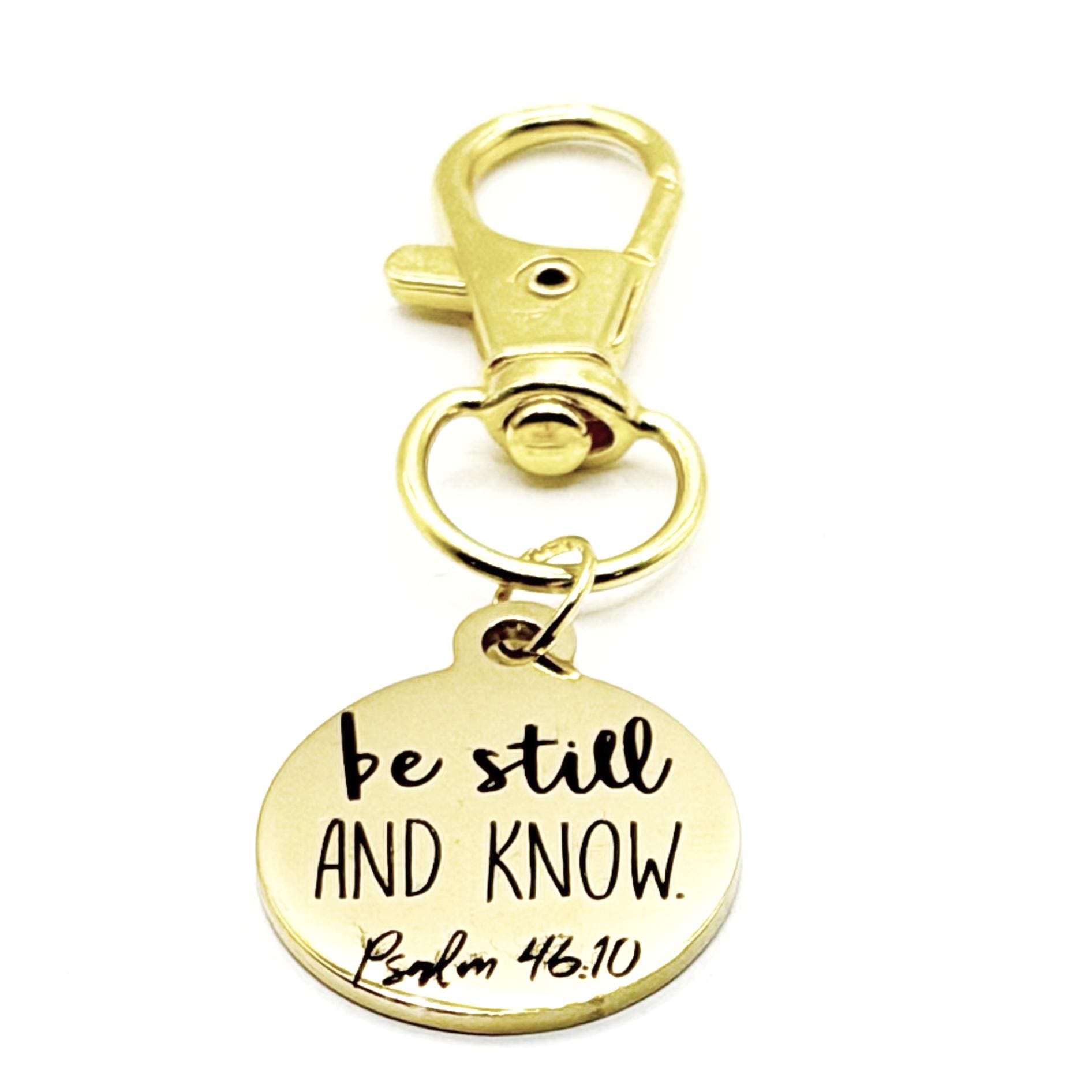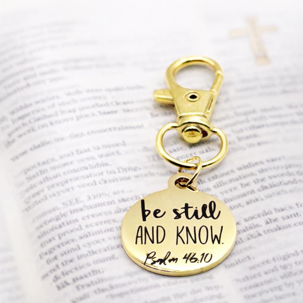 Carry a quiet reminder of God’s peace wherever you go. This gold-plated stainless steel clip on charm features the engraved words Be still and know Psalm 46:10 on a 19mm disc. Attached to a sturdy 32mm alloy lobster clasp, it easily clips to keys, purses, backpacks, or zipper pulls, making it a meaningful daily encouragement.