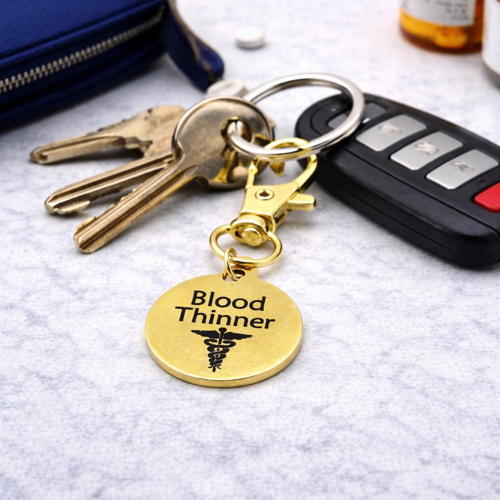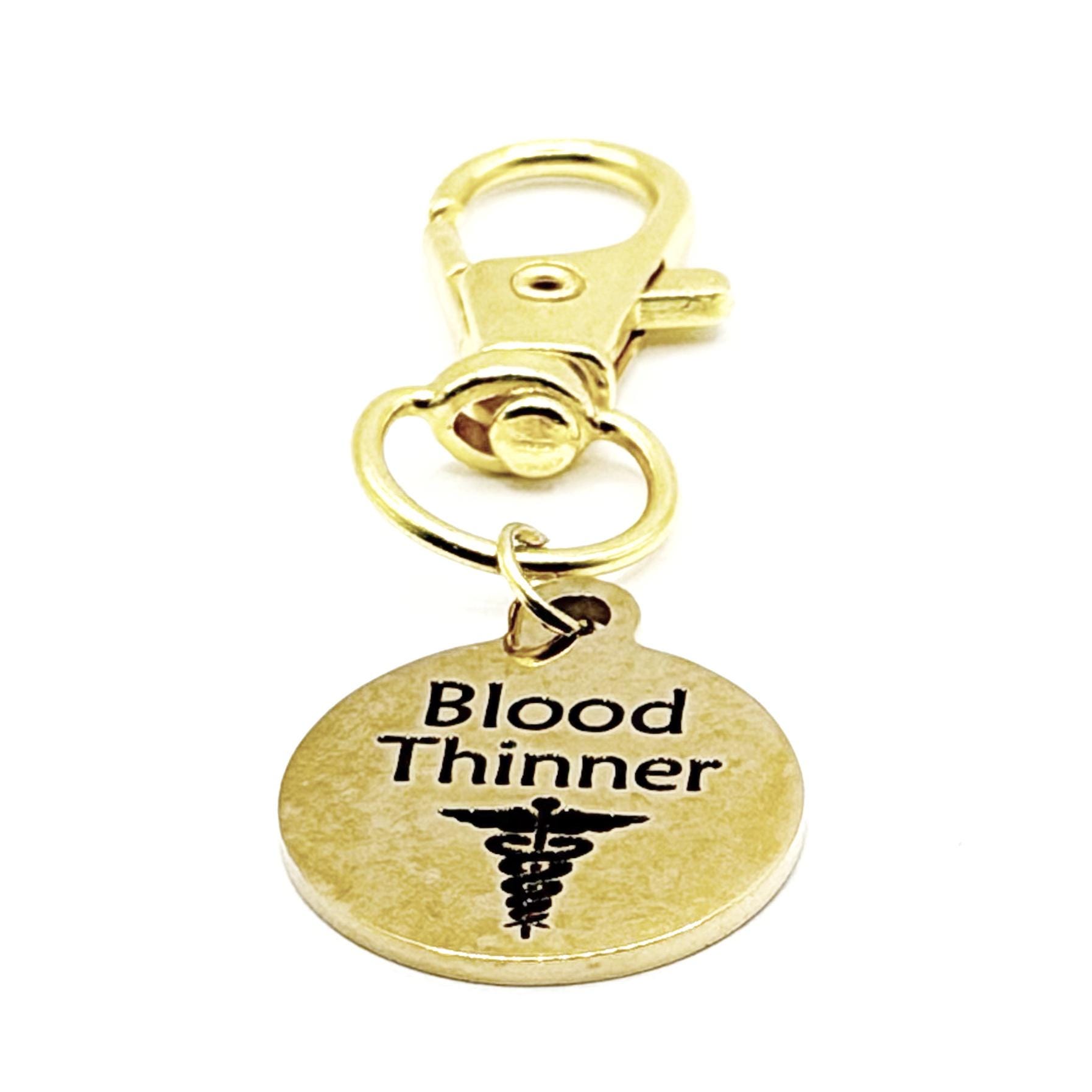 The 19mm round charm is engraved with “Blood Thinner” and paired with a durable 32mm alloy lobster clasp, making it easy to attach to backpacks, purses, zipper pulls, keychains, medical bags, or travel accessories. The gold plated finish gives a warm, polished look while remaining practical and durable for daily wear.