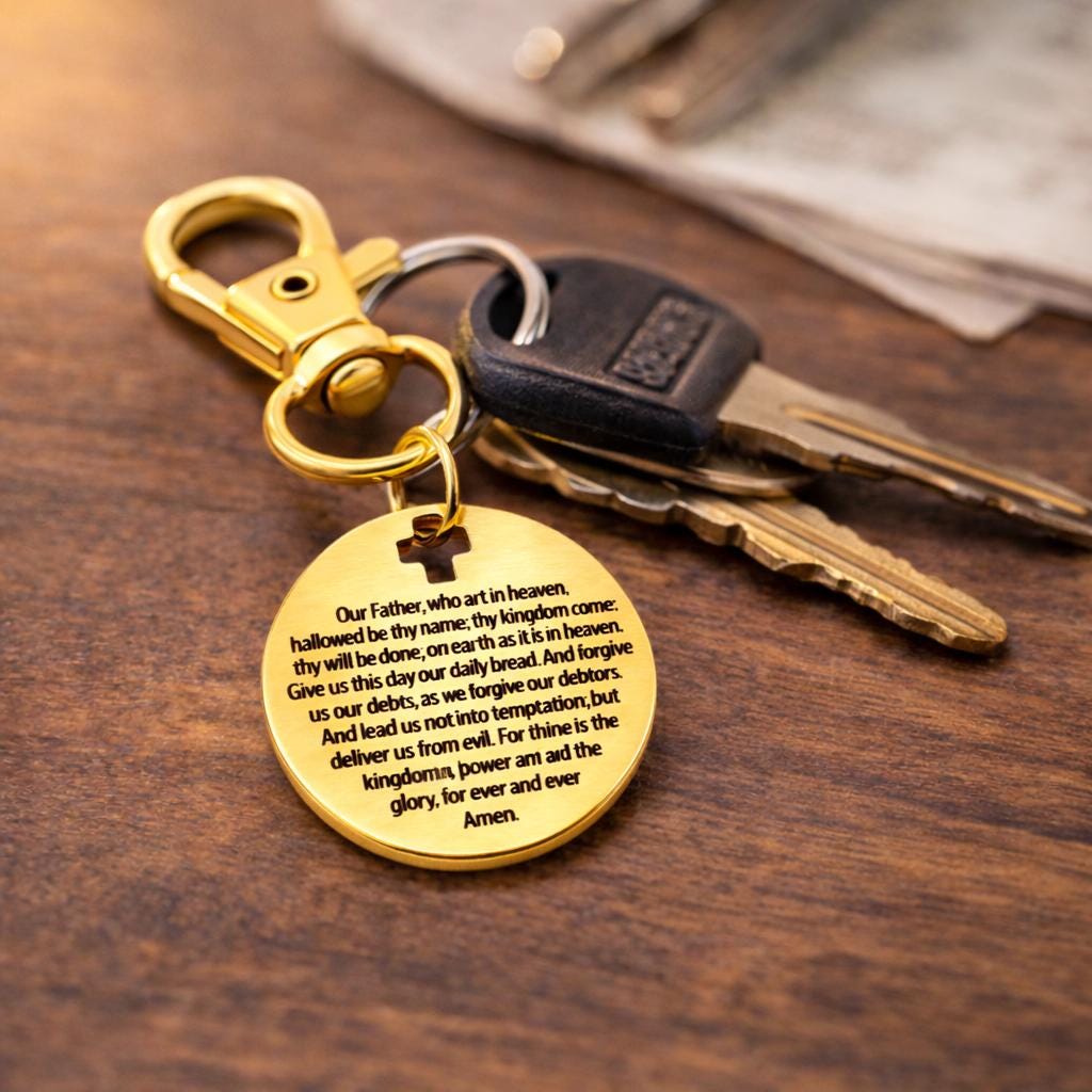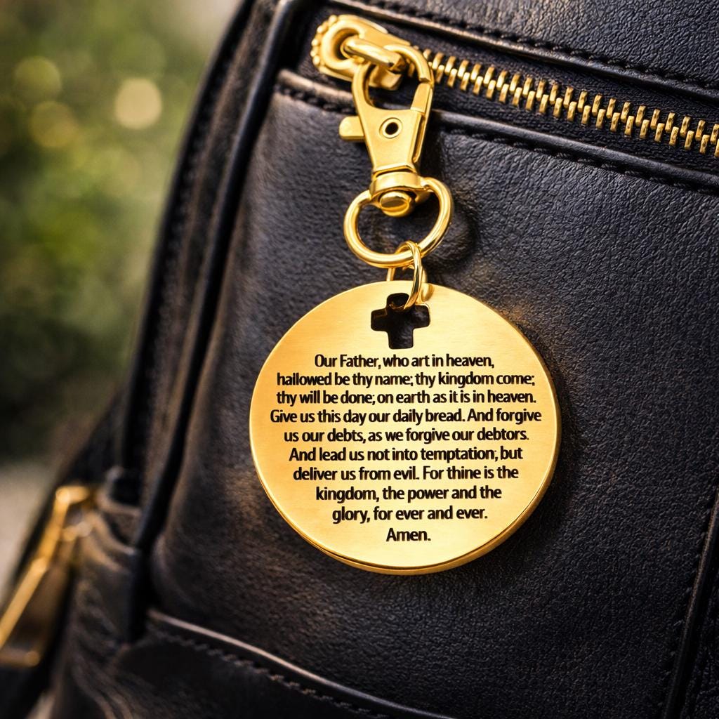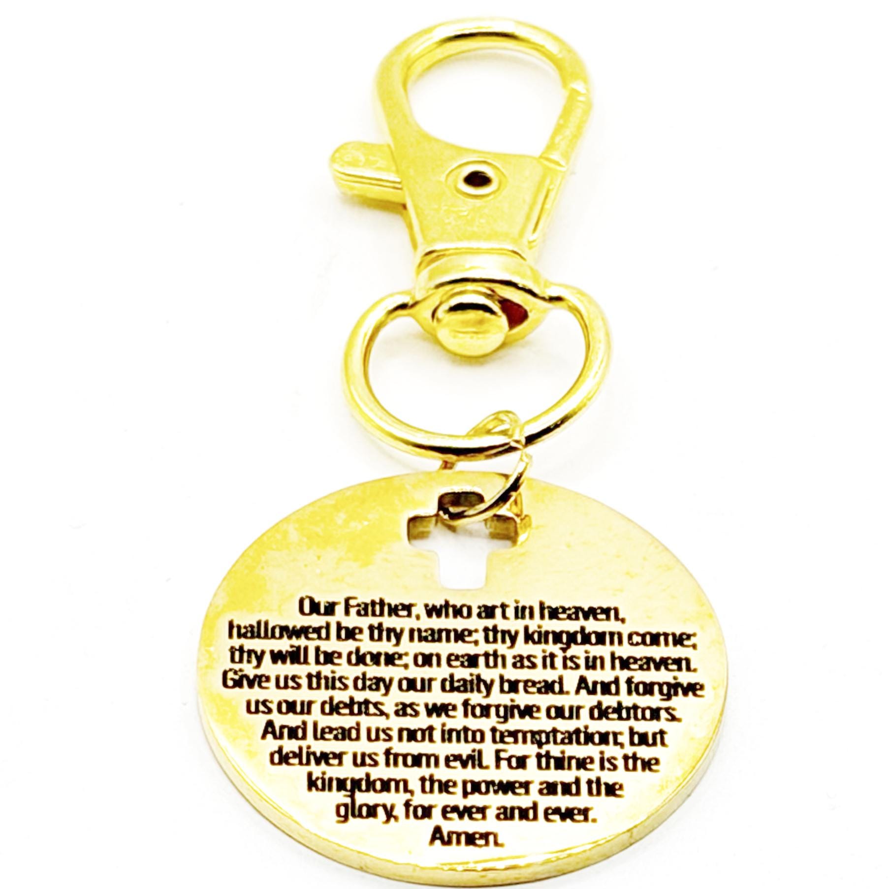 Carry your faith with you wherever you go with this beautifully engraved The Lord's Prayer gold-plated clip on charm. Designed with intention and reverence, this round stainless steel charm features a delicate cross cut-out and is securely attached to a 32mm alloy lobster clasp for easy clipping to keys, bags, lanyards, or purses.