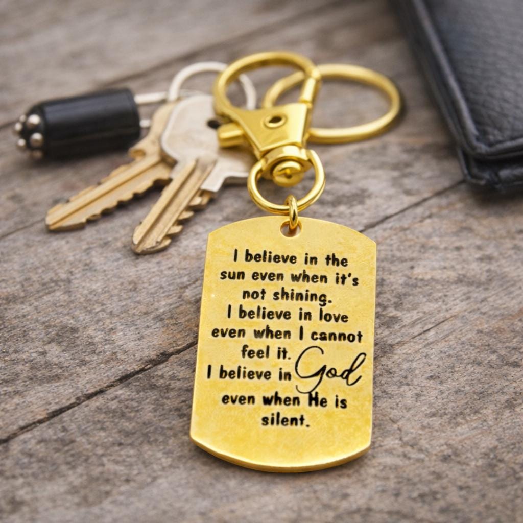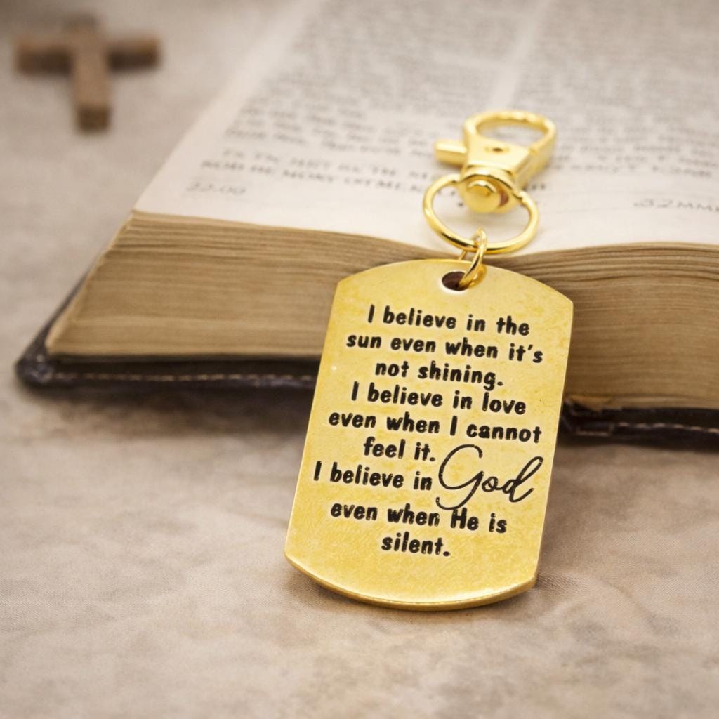 Carry a powerful reminder of faith wherever you go with this gold-plated stainless steel clip-on charm. Featuring the exact engraved message: “I believe in the sun even when it's not shining. I believe in love even when I cannot feel it. I believe in God even when He is silent” this meaningful dog tag charm offers daily encouragement and quiet strength.