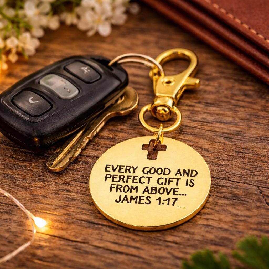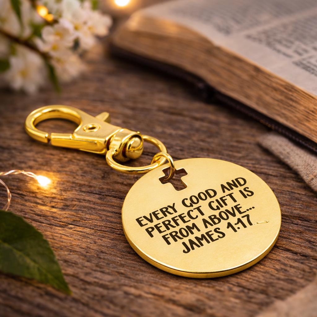 Carry a beautiful reminder of faith wherever you go. This gold-plated stainless steel clip on charm features the encouraging words from James 1:17, engraved exactly as shown: