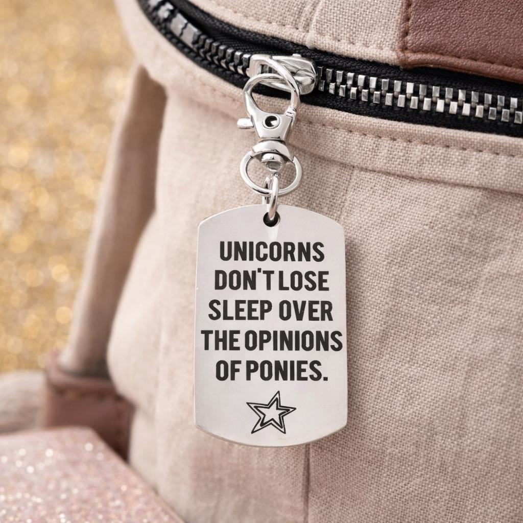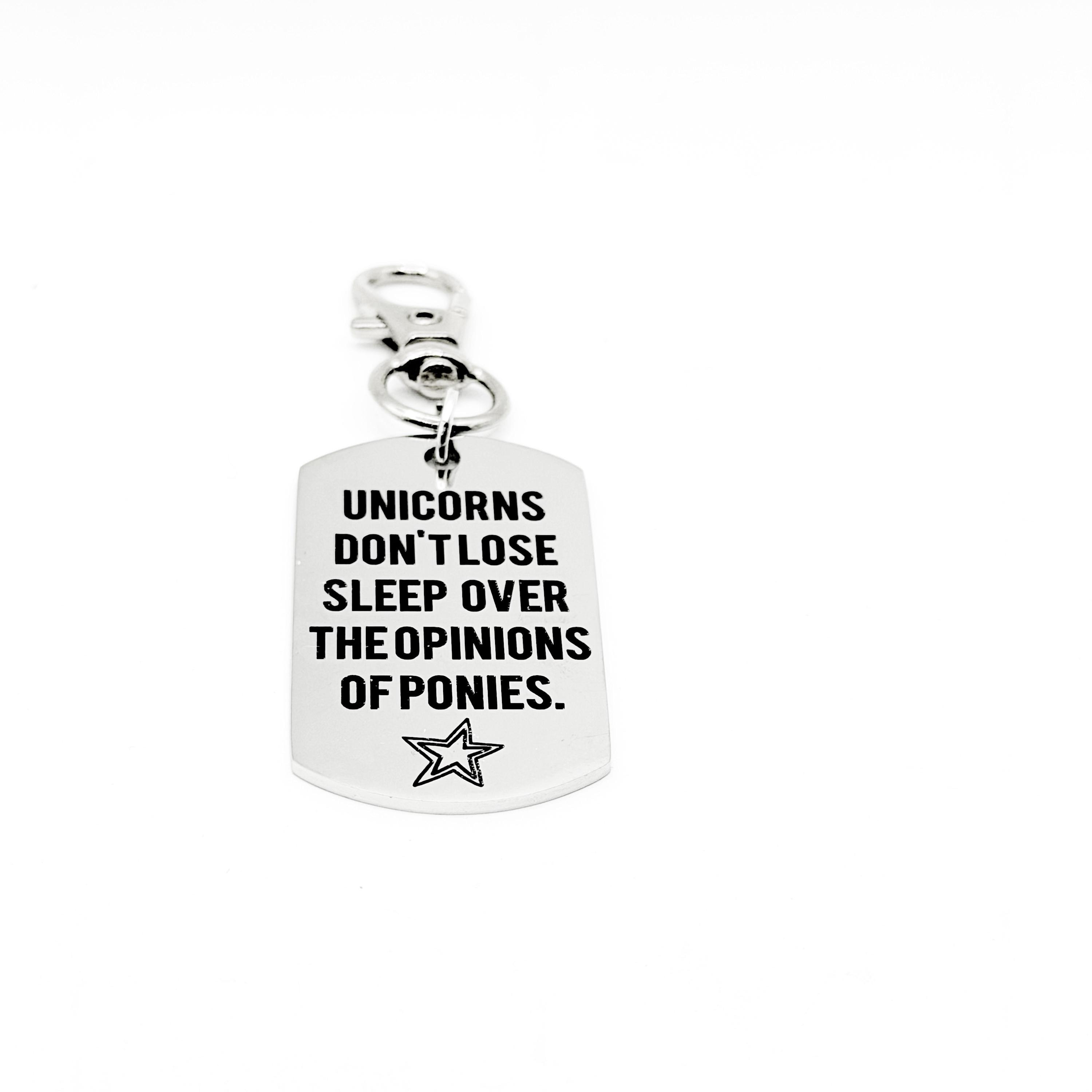 Carry a reminder of confidence and self-belief wherever you go. This JKCE Designs stainless steel clip on charm features the engraved message "Unicorns don't lose sleep over the opinion of ponies," offering a playful yet empowering reminder to stay true to yourself.