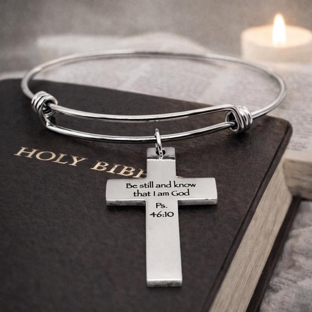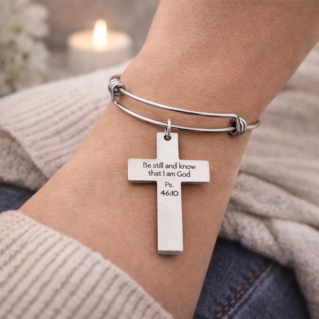 The bracelet is designed for everyday wear and gently expands to slide comfortably onto the wrist. Its clean stainless steel finish complements any style while keeping the focus on the powerful message of Psalm 46:10. This bracelet makes a thoughtful gift for birthdays, baptisms, confirmations, church groups, or anyone who appreciates faith inspired jewelry.