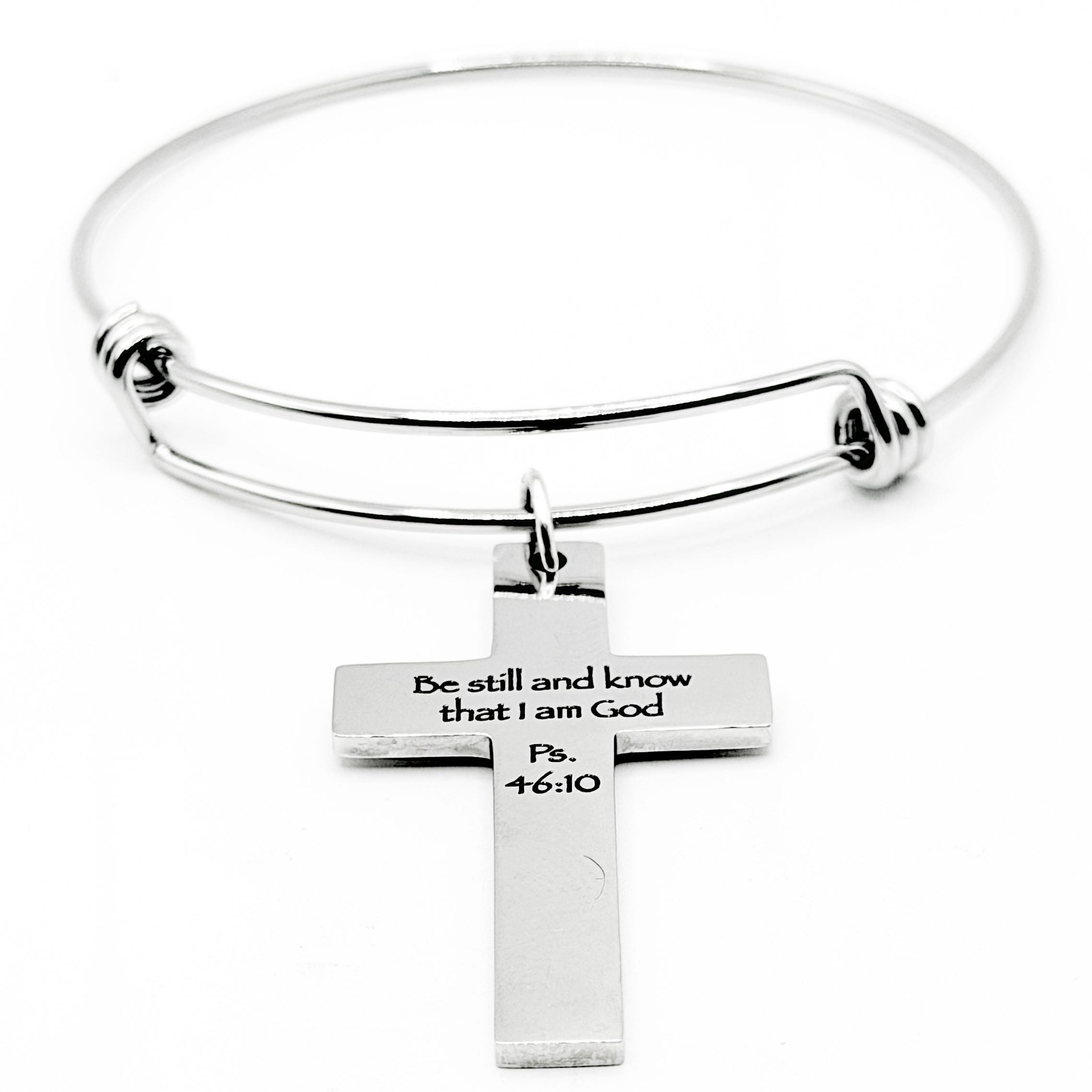 Carry a meaningful reminder of faith with this stainless steel cross charm bracelet engraved with the comforting scripture “Be still and know that I am God Ps. 46:10.” The polished cross charm measures approximately 1 5/8 inches long and 1 inch wide and hangs from a stainless steel expanding bangle bracelet for a simple, timeless look.