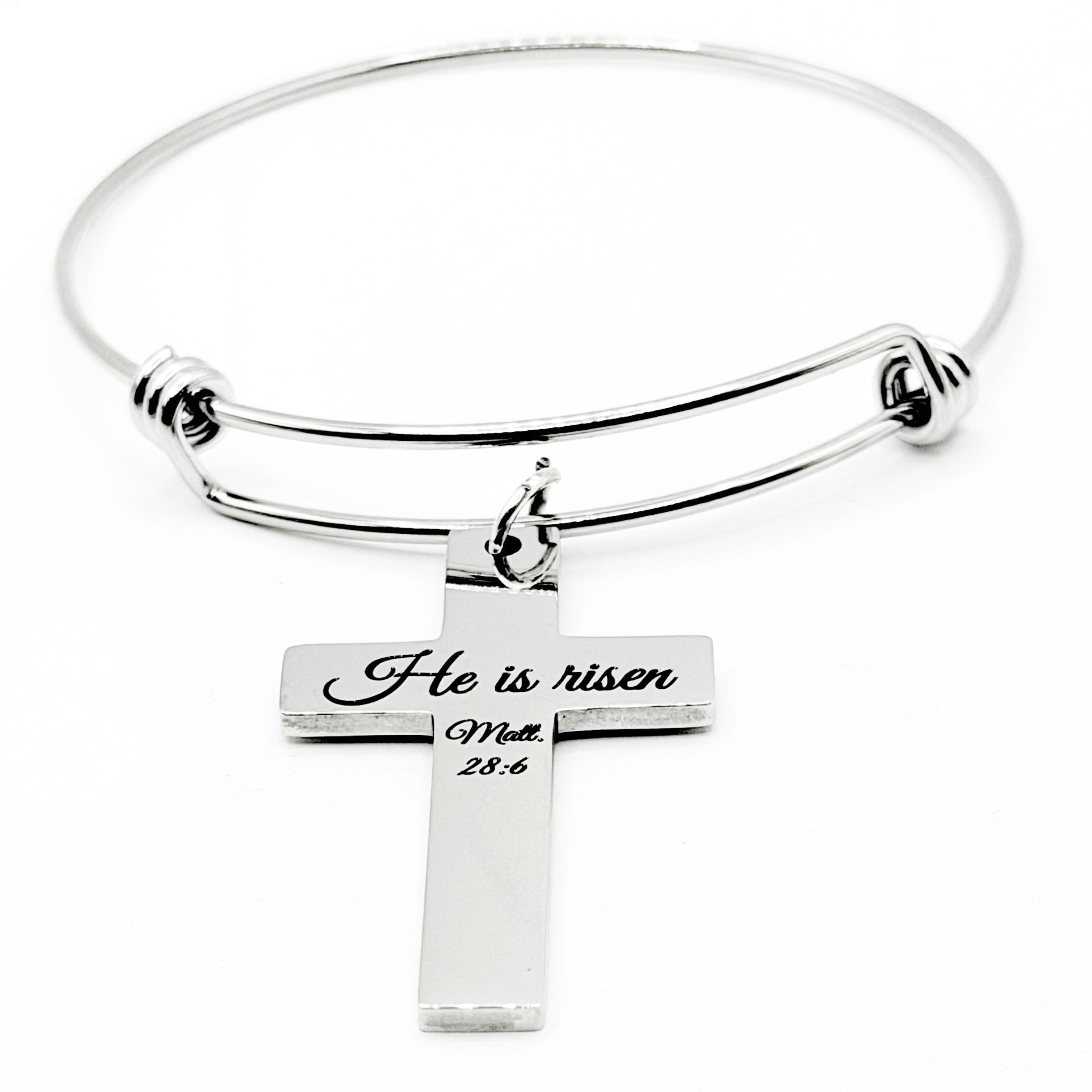 This stainless steel cross charm bracelet engraved with the message "He is risen Matt .28:6" is a beautiful reminder of the hope and promise of the resurrection. Designed with a polished stainless steel cross charm suspended from a stainless steel expanding bangle, this bracelet offers a simple yet meaningful way to carry your faith every day.