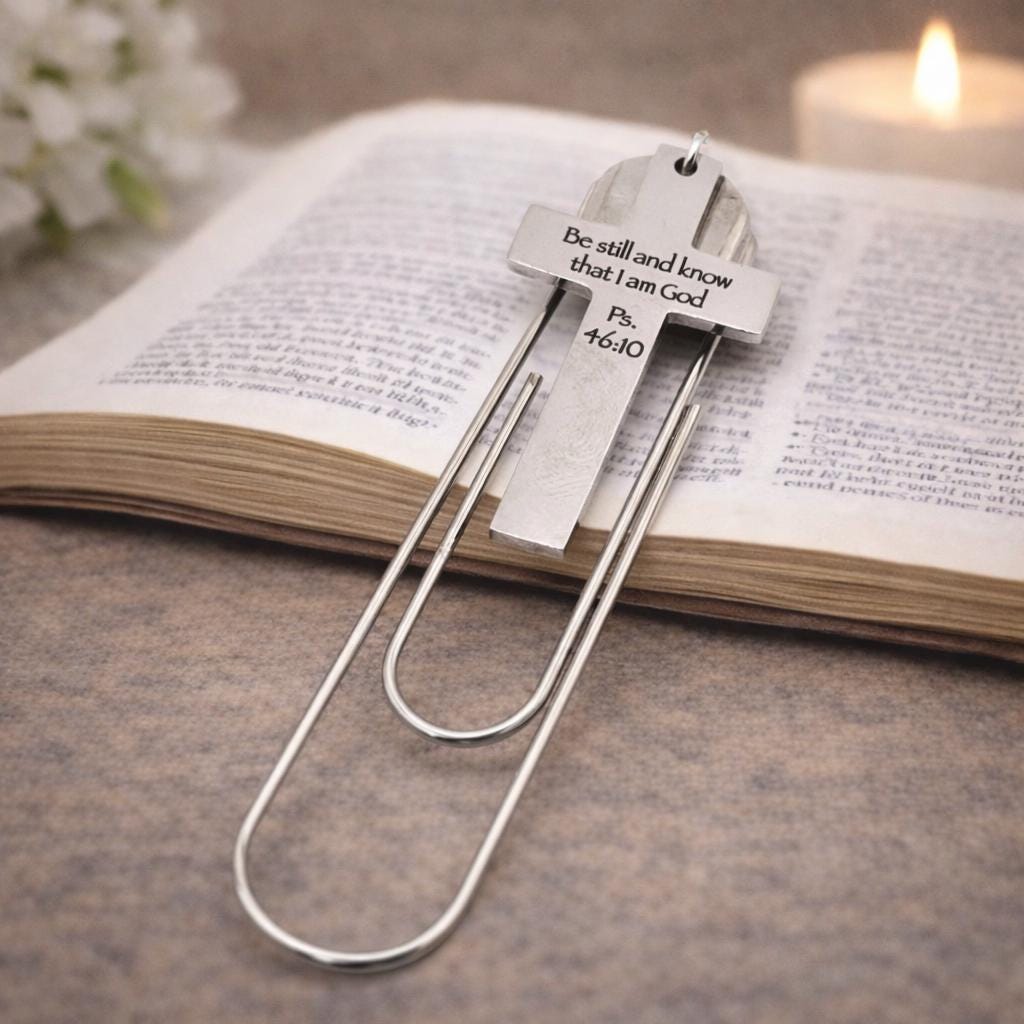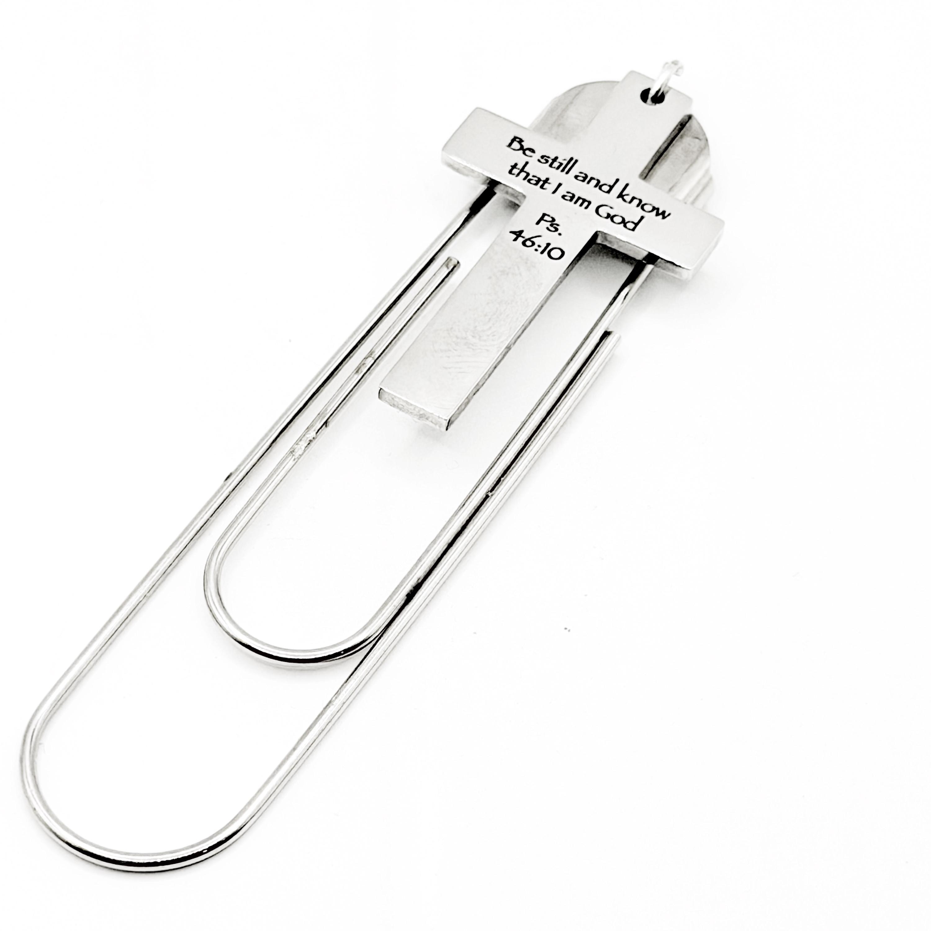 Mark your place with a meaningful reminder of faith using this stainless steel cross paperclip bookmark engraved with the comforting scripture “Be still and know that I am God Ps. 46:10.” The polished cross charm measures approximately 1 5/8 inches long and 1 inch wide and is attached to a 3 1/2 inch paperclip style bookmark that slides easily over book pages.