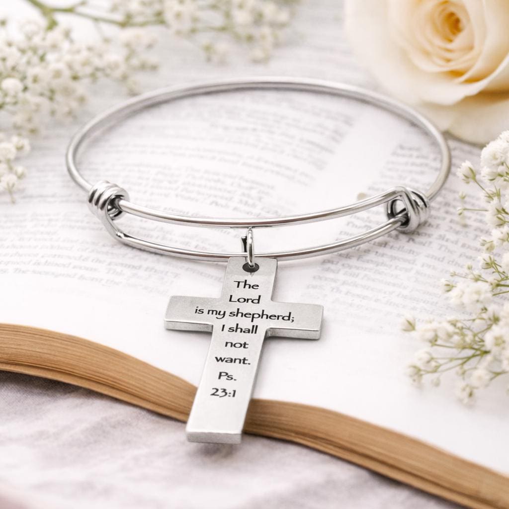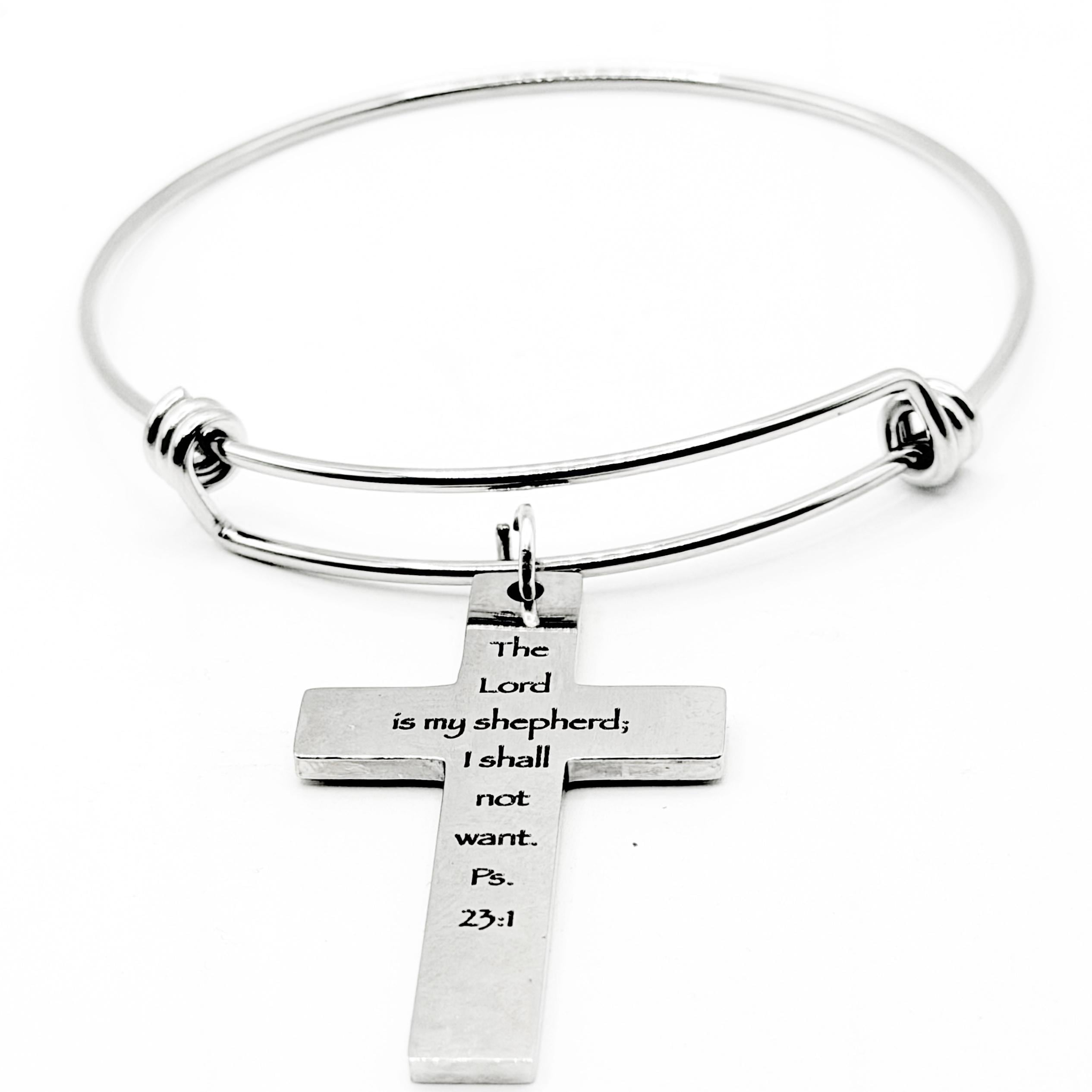 Carry a reminder of God’s guidance and provision wherever you go with this meaningful cross charm bracelet. The stainless steel cross charm is engraved with the comforting words “The Lord is my shepherd I shall not want Ps. 23:1,” a beloved verse that speaks of faith, trust, and divine care. The charm measures approximately 1 5/8 inches long by 1 inch wide and hangs from a stainless steel expanding bangle designed for comfortable everyday wear.