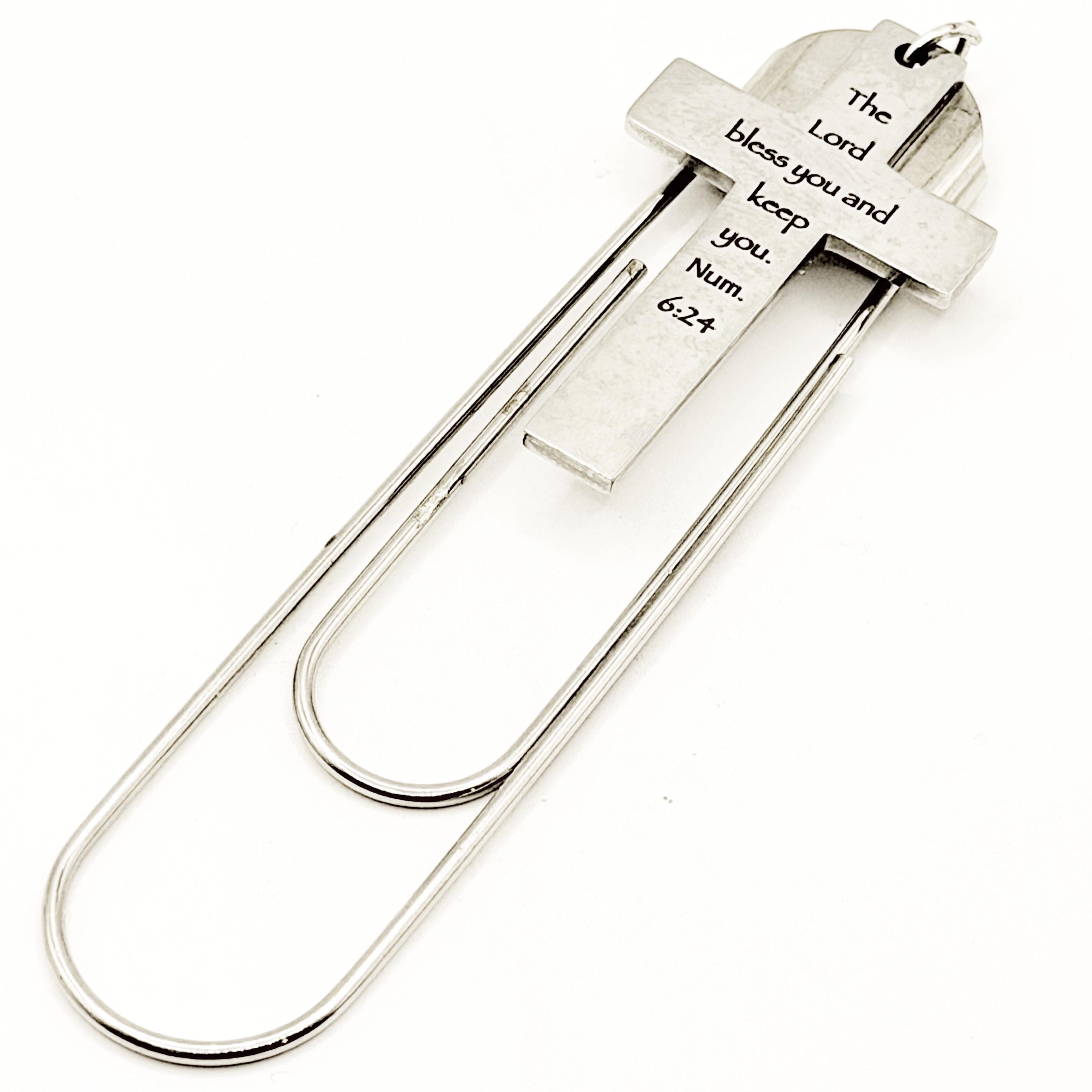 Carry a quiet reminder of faith within the pages you read. This stainless steel cross charm bookmark features the engraved message “The Lord bless you and keep you Num 6:24,” offering encouragement each time you open your book or Bible. The cross charm measures approximately 1 5/8 inches long by 1 inch wide and is attached to a 3 1/2 inch stainless steel paperclip style bookmark designed to slide securely over pages without damaging them. Crafted from durable stainless steel, this bookmark is made for everyday use and lasting beauty. It makes a thoughtful gift for Bible study groups, pastors, teachers, friends, or anyone who treasures scripture. To care for your bookmark, simply wipe clean with a soft cloth and store in a dry place when not in use.