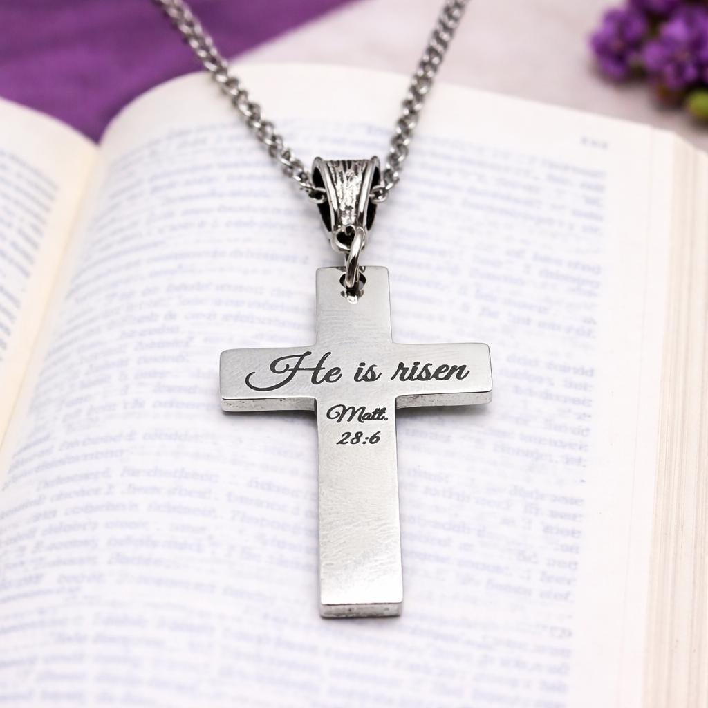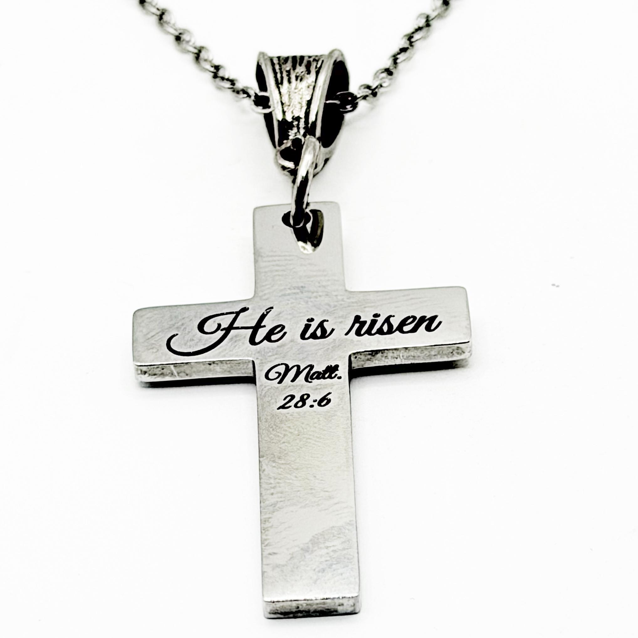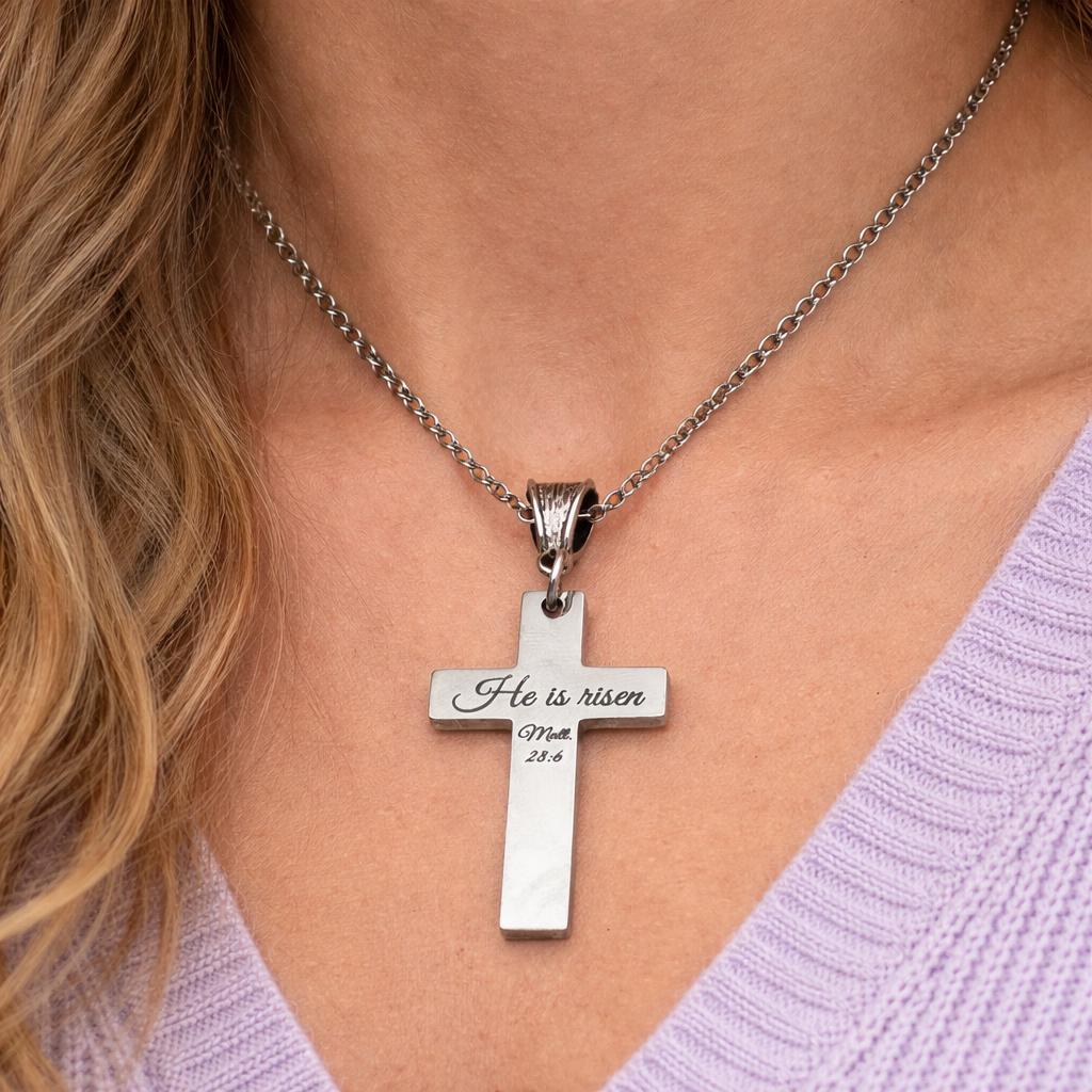 This Christian Easter gift features a stainless steel cross charm engraved with the message "He is risen Matt .28:6", a powerful reminder of the resurrection found in Matthew 28:6.