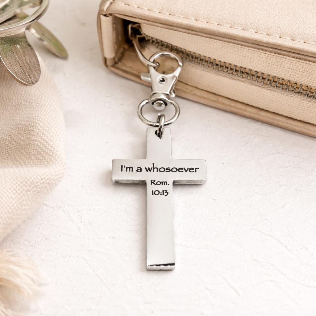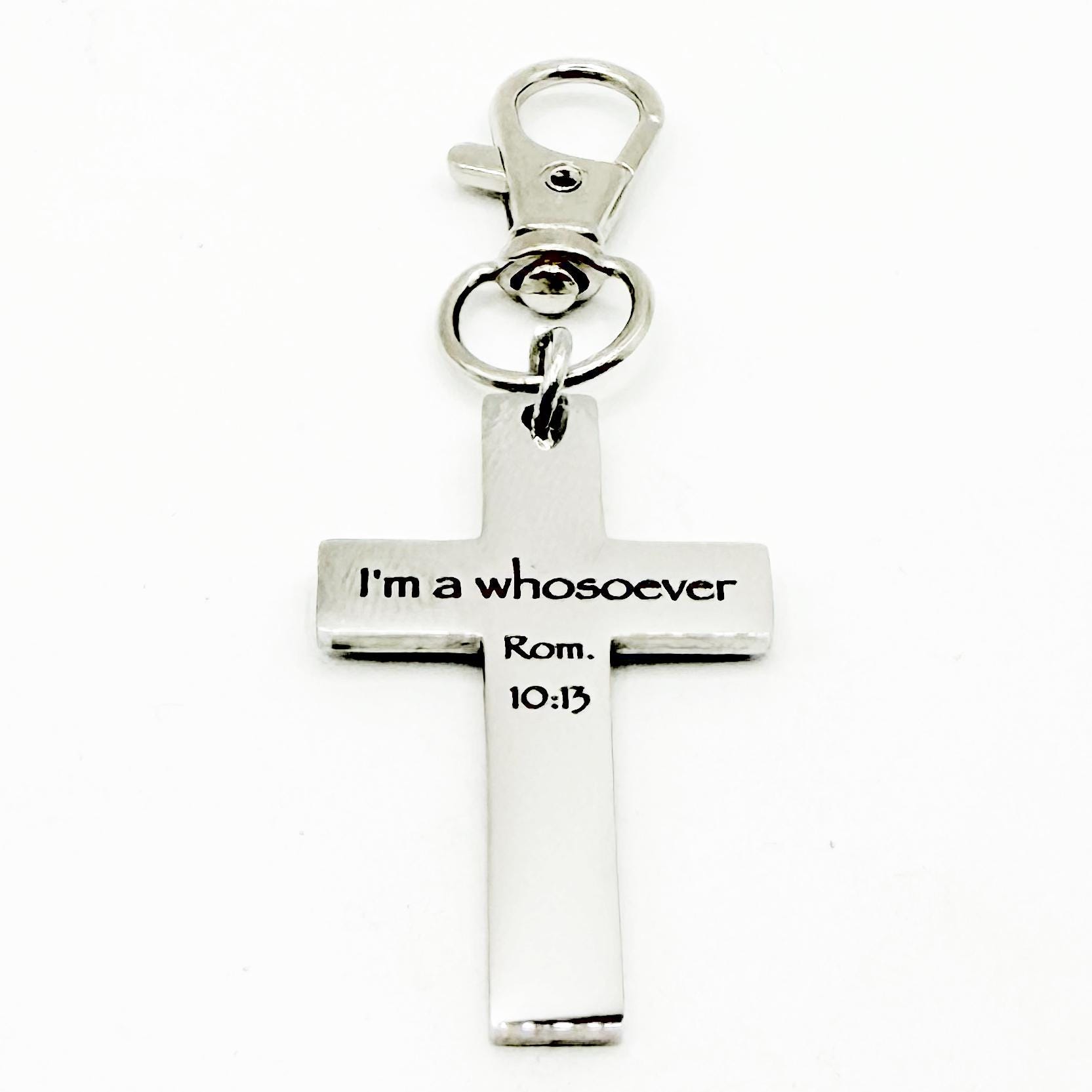Carry a powerful reminder of faith wherever you go with this stainless steel cross clip on charm engraved with “I'm a whosoever Rom. 10:13.” Designed to reflect the promise that all who call on His name are welcomed, this piece is both meaningful and timeless. The charm measures approximately 1 5/8 inches long by 1 inch wide and is paired with a durable 32mm alloy lobster clasp, making it easy to attach to keys, bags, purses, or zippers. Crafted from stainless steel, it offers lasting shine and everyday durability. This charm makes a thoughtful gift for loved ones, church groups, or anyone who wants to carry a visible expression of their faith. To maintain its finish, avoid prolonged exposure to water and harsh chemicals and store in a dry place when not in use.